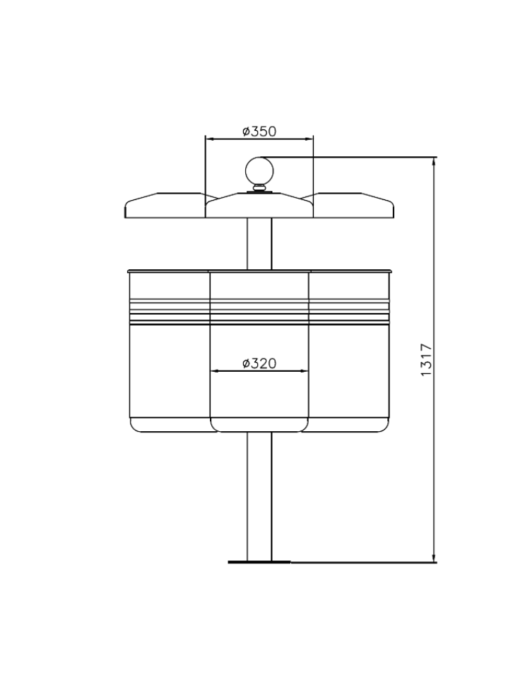 Cestino per la raccolta differenziata ideale per l’esterno, composto da 4 contenitori a forma cilindrica ottenuto dalla calandratura di lamiera prezincata, chiuso tramite elettrosaldatura. La parte superiore viene bordata con un anello elettrosaldato ottenuto da tornitura in lastra, mentre la parte inferiore viene chiusa con un fondello opportunamente forato per l’eventuale scolo di acqua meteorica o di periodica pulizia. Viene fornito completo di reggisacco in acciaio incernierato sul bordo interno superiore dei contenitori e libero di ruotare per facilitare l’inserimento del sacchetto. Per togliere il sacchetto, bisogna svitare leggermente la vite e far ruotare il contenitore di 45°. I contenitori vengono fissati alla colonna di sostegno in tubolare di acciaio, chiusa superiormente come ornamento da una sfera in acciaio forgiato, mente la parte inferiore è dotata di flangia predisposta di n.3 fori per il fissaggio al suolo tramite tasselli ad espansione. È dotato di coperchi per riparare da eventi atmosferici saldati sul palo e all’interno sono dotati di posacenere estraibile. Il cestino è zincato e verniciato con polveri poliestere termoindurenti nelle diverse colorazioni RAL. La viteria è in acciaio inox.