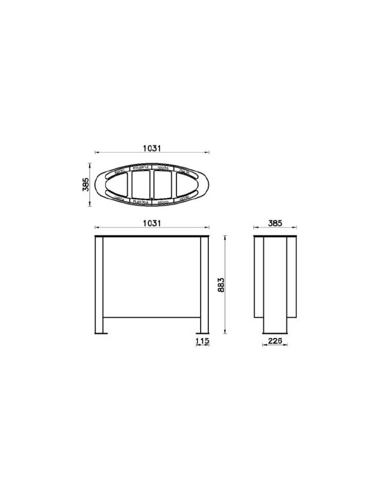 Cestino di forma ellittica per la raccolta differenziata di 4 tipi di rifiuto. Gambe laterali calandrate in acciaio con piastre base per il fissaggio a pavimento. Il cestino è fornito di quattro contenitori interni in acciaio. Tutte le parti metalliche sono in acciaio inox, così come la viteria. Cestino portarifiuti per la raccolta differenziata idoneo sia all’uso esterno che interno. Adatto a centri commerciali, aeroporti e stazioni. Utilizzabile anche in piazze, camping, scuole ed università.