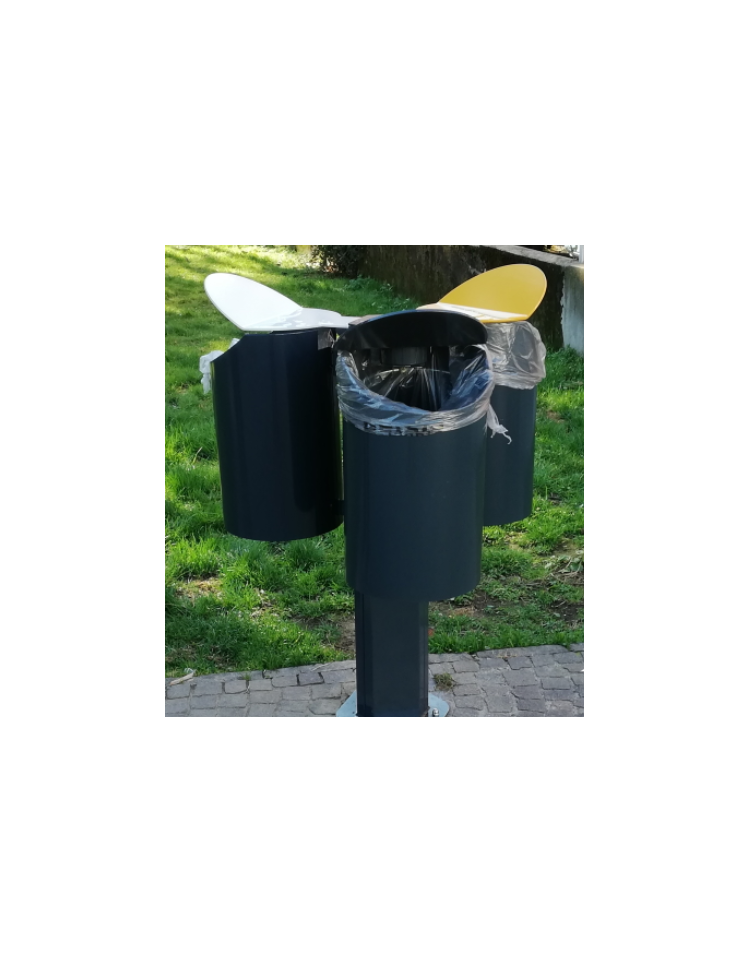 Cestino per la raccolta differenziata, può essere composto da 2 contenitori. I contenitori di forma cilindrica hanno una capacità di 30 litri. Nella parte superiore viene fornito di coperchio con o senza posacenere in lamiera, piegata nella parte frontale per facilitare l’introduzione dei rifiuti. Il cestino è costituito da un palo di sostegno, il quale può essere da tassellare al suolo. Tutte le parti metalliche sono zincate e verniciate a polveri poliestere termoindurenti nelle colorazioni RAL. La viteria è in acciaio inox.