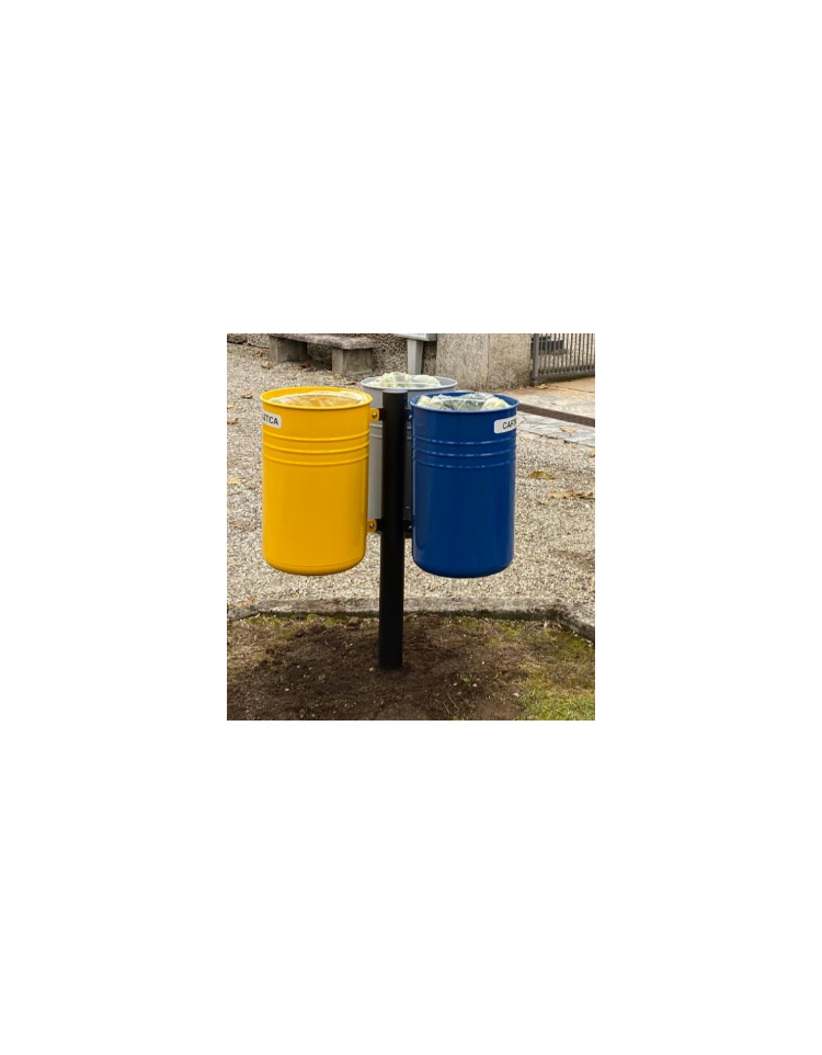 Cestino composto da 2 contenitori a forma cilindrica ottenuto dalla calandratura di lamiera prezincata, chiuso tramite elettrosaldatura. La parte superiore è bordata con un anello elettrosaldato ottenuto da tornitura in lastra. La parte inferiore è chiusa con un fondello opportunamente forato per l’eventuale scolo di acqua meteorica o di periodica pulizia. E’ fornito completo di reggisacco in acciaio. Il reggisacco è incernierato sul bordo interno superiore dei contenitori e libero di ruotare per facilitare l’inserimento del sacchetto. Per togliere il sacchetto bisogna svitare leggermente la vite e far ruotare il contenitore di 45°. I contenitori sono fissati alla colonna di sostegno in tubolare di acciaio. La colonna è chiusa superiormente. La parte inferiore è dotata di flangia predisposta di n.3 fori per il fissaggio al suolo tramite tasselli ad espansione. Il cestino è zincato e verniciato con polveri poliestere termoindurenti nelle diverse colorazioni RAL. La viteria è in acciaio inox.