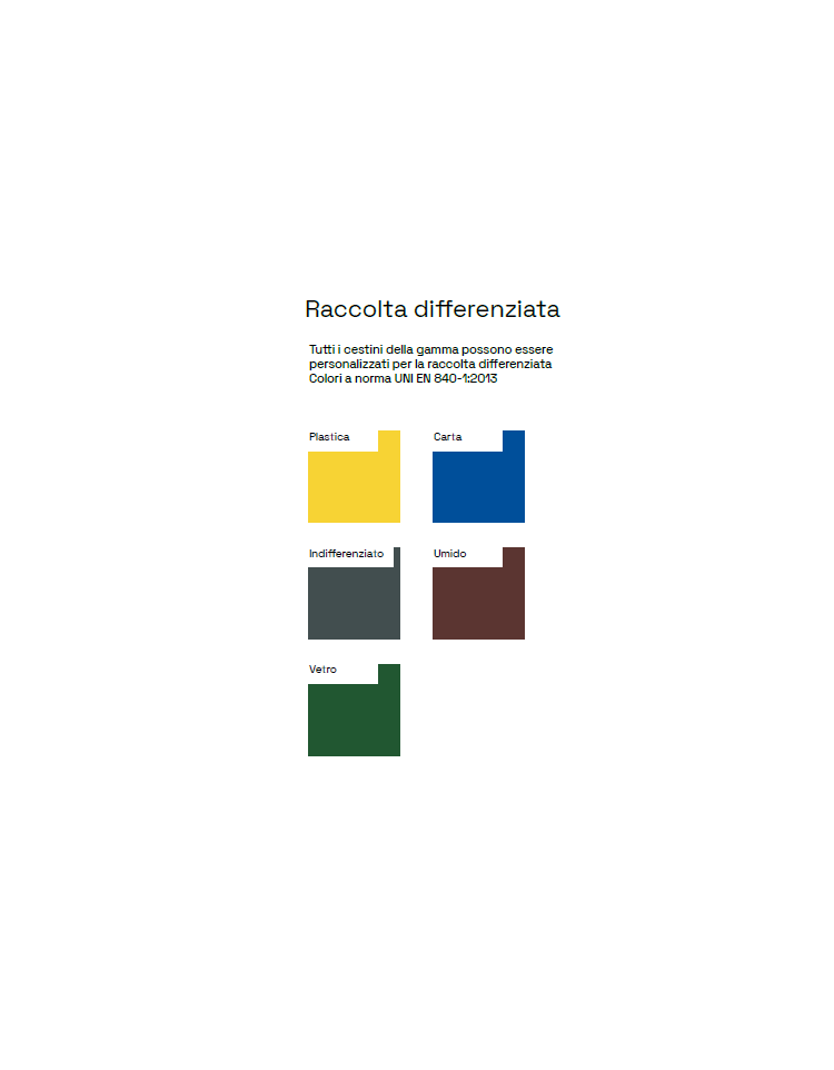 Cestino composto da 4 contenitori a forma cilindrica ottenuto dalla calandratura di lamiera prezincata, chiuso tramite elettrosaldatura. La parte superiore è bordata con un anello elettrosaldato ottenuto da tornitura in lastra. La parte inferiore è chiusa con un fondello opportunamente forato per l’eventuale scolo di acqua meteorica o di periodica pulizia. E’ fornito completo di reggisacco in acciaio. Il reggisacco è incernierato sul bordo interno superiore dei contenitori e libero di ruotare per facilitare l’inserimento del sacchetto. Per togliere il sacchetto bisogna svitare leggermente la vite e far ruotare il contenitore di 45°. I contenitori sono fissati alla colonna di sostegno in tubolare di acciaio. La colonna è chiusa superiormente. La parte inferiore è dotata di flangia predisposta di n.3 fori per il fissaggio al suolo tramite tasselli ad espansione. Il cestino è zincato e verniciato con polveri poliestere termoindurenti nelle diverse colorazioni RAL. La viteria è in acciaio inox.