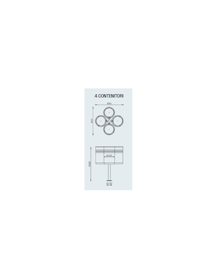 Cestino composto da 4 contenitori a forma cilindrica ottenuto dalla calandratura di lamiera prezincata, chiuso tramite elettrosaldatura. La parte superiore è bordata con un anello elettrosaldato ottenuto da tornitura in lastra. La parte inferiore è chiusa con un fondello opportunamente forato per l’eventuale scolo di acqua meteorica o di periodica pulizia. E’ fornito completo di reggisacco in acciaio. Il reggisacco è incernierato sul bordo interno superiore dei contenitori e libero di ruotare per facilitare l’inserimento del sacchetto. Per togliere il sacchetto bisogna svitare leggermente la vite e far ruotare il contenitore di 45°. I contenitori sono fissati alla colonna di sostegno in tubolare di acciaio. La colonna è chiusa superiormente. La parte inferiore è dotata di flangia predisposta di n.3 fori per il fissaggio al suolo tramite tasselli ad espansione. Il cestino è zincato e verniciato con polveri poliestere termoindurenti nelle diverse colorazioni RAL. La viteria è in acciaio inox.