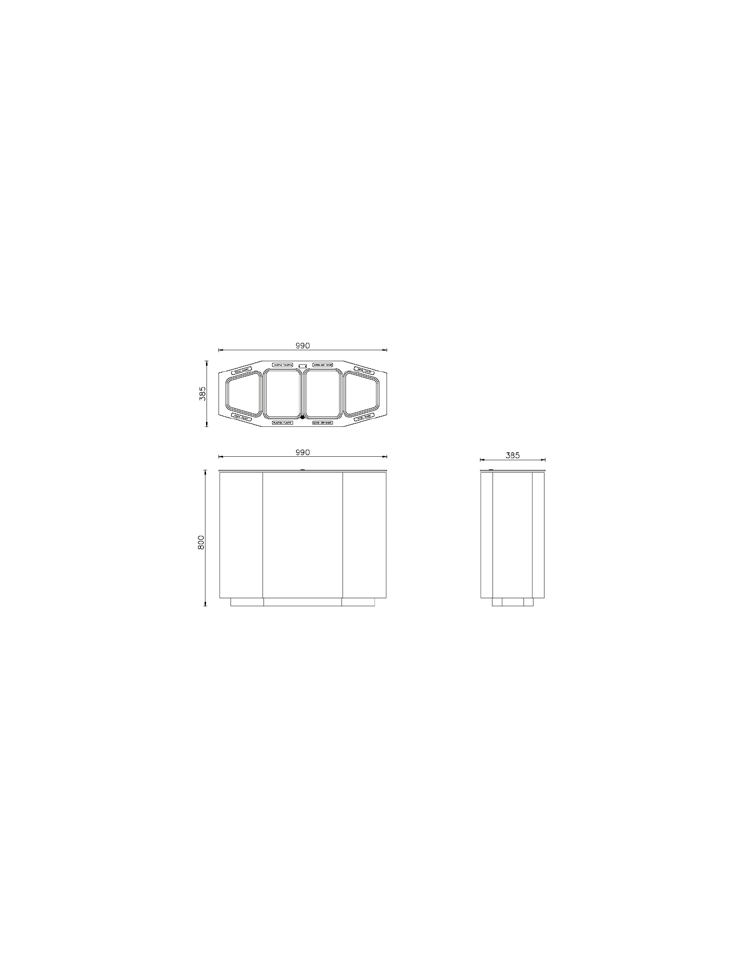 Cestino per la raccolta differenziata di 4 tipi di rifiuto. Il fusto è in acciaio inox, con un telaio interno in piatto. Il cestino è fornito di contenitori interni in lamiera zincata. Ogni contenitore interno è identificato da una fascia colorata in acciaio posta nella parte superiore della bocca. Il coperchio superiore si può aprire sbloccando la serratura con la chiave universale fornita. Tutte le parti metalliche sono protette da cataforesi o zincatura e successivamente verniciate con vernici a polvere poliestere. Tutta la viteria è in acciaio inox.