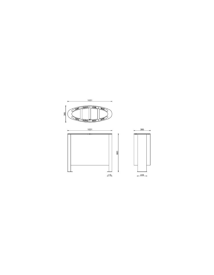 Cestino di forma ellittica per la raccolta differenziata di 4 tipi di rifiuto. Gambe laterali calandrate in acciaio con piastre base per il fissaggio a pavimento. Il cestino è fornito di quattro contenitori interni in acciaio. Ogni contenitore interno è identificato da una fascia colorata in acciaio posta nella parte superiore della bocca. Il coperchio si può aprire sbloccando la serratura con la chiave universale fornita. Pannelli laterali in lamiera in acciaio. Tutte le parti metalliche sono protette da zincatura e successivamente verniciate con vernici a polvere poliestere. Tutta la viteria è in acciaio inox.