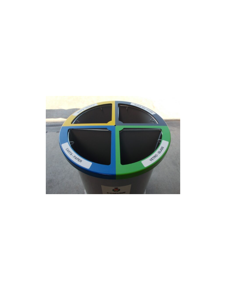 Cestino per la raccolta differenziata ideale per grandi strutture come aeroporti, centri commerciali, ecc… Struttura cilindrica esterna composta in lamiera d’acciaio liscia calandrata con fondo in lamiera d’acciaio che poggia su una base circolare in piatto calandrato. Il contenitore è diviso internamente in 4 settori tramite pannelli in lamiera d’acciaio saldati ad un sostegno centrale in tubo, ciascuna sezione è completa di reggi-sacco in trafilato d’acciaio. Il coperchio aprile in lamiera tagliata al laser e ribordata mediante tornitura viene finito con trattamenti di zincatura e verniciatura a liquido in 4 colori e scritta identificativa secondo la divisione per la raccolta differenziata. Tutta la viteria è in acciaio inox. Non avendo coperchio di chiusura è preferibile l’uso in ambienti interni o protetti. Su richiesta può essere predisposto per il fissaggio al suolo.