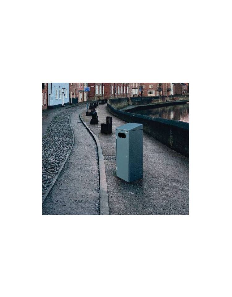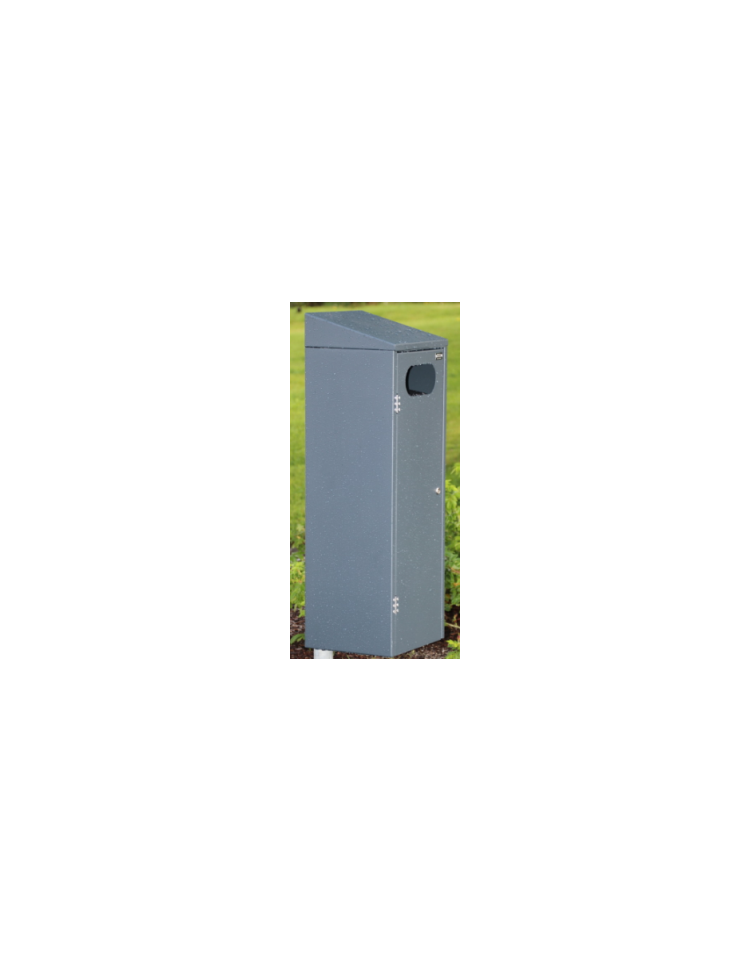 Cestino di forma quadra a 4 settori completamente realizzato in acciaio. Il fusto e il coperchio inclinato sono prodotti interamente in lamiera, tagliata a laser e opportunamente sagomata. L’introduzione dei rifiuti avviene attraverso un foro di dimensioni 200×90 mm presente nella porta frontale, la quale è dotata di serratura a chiave universale. Il cestino è completo di contenitore interno estraibile dalla porta. Il retro del fusto è predisposto per il tassellamento al muro con dei tasselli. Tutte le parti metalliche sono zincate e verniciate a polveri poliestere termoindurenti disponibili in diverse colorazioni RAL. La viteria è in acciaio inox. Il Cestino quadro tetto inclinato Amalfi è nato come cestino da posizionare a batteria per la raccolta differenziata con possibilità di applicare la scritta della raccolta e verniciare di colore differente l’intero cestino o la sola porta. Ma è utilizzabile anche come singolo cestino da posizionare all’esterno di negozi, centri commerciali, condomini, hotel, camping.
