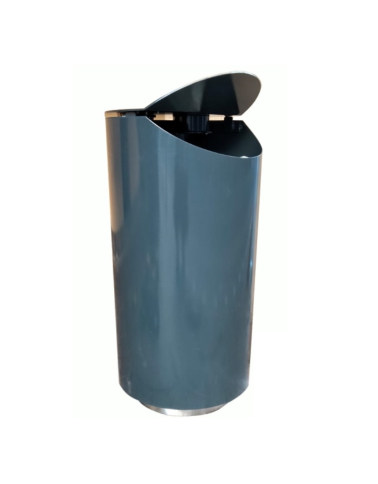 Cestino costituito da 20 raggi in piatto di acciaio opportunamente piegati e uniti con saldatura a tre anelli in piatto di acciaio nella parte inferiore e ad un anello in tondino di acciaio sulla parte superiore. La base è in ferro. Il cestino è fornito con contenitore interno a forma cilindrica ottenuto dalla calandratura a freddo di lamiera, chiuso tramite elettrosaldatura. La parte superiore viene bordata con un anello elettrosaldato ottenuto da tornitura in lastra, mentre la parte inferiore viene chiusa con un fondello opportunamente forato per l’eventuale scolo di acqua meteorica o di periodica pulizia. Tutte le parti metalliche sono zincate a caldo e verniciate a polveri poliestere termoindurente. La viteria è in acciaio inox.