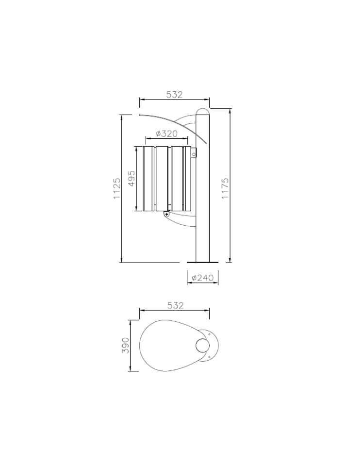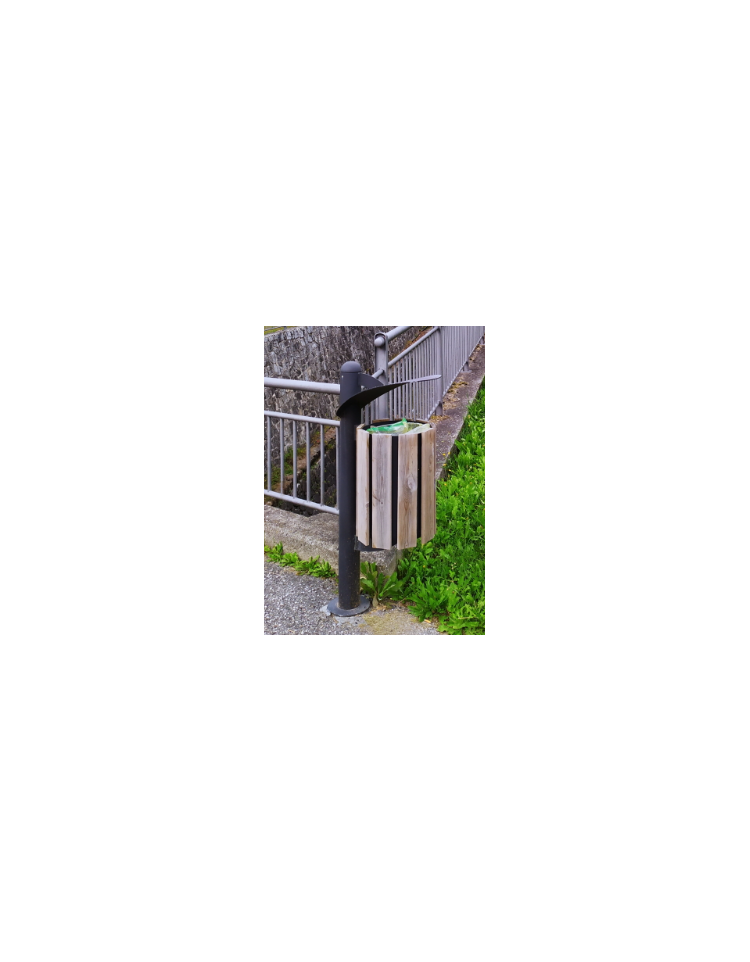 Cestino composto da contenitore a forma cilindrica. La parte superiore viene bordata con un anello elettrosaldato, mentre la parte inferiore viene chiusa con un fondello opportunamente forato per l’eventuale scolo di acqua meteorica o di periodica pulizia. Il contenitore è ricoperto da doghe in legno di pino nordico trattato in autoclave e viene fissato alla colonna di sostegno in tubolare di acciaio, chiusa superiormente da una calotta semisferica in lamiera, mente la parte inferiore è dotata di flangia predisposta per il fissaggio al suolo tramite tasselli. Viene fornito completo di reggisacco in acciaio e coperchio fissato al palo, completo di posacenere. Il cestino è zincato e verniciato con polveri poliestere termoindurenti nelle diverse colorazioni. La viteria è in acciaio inox.