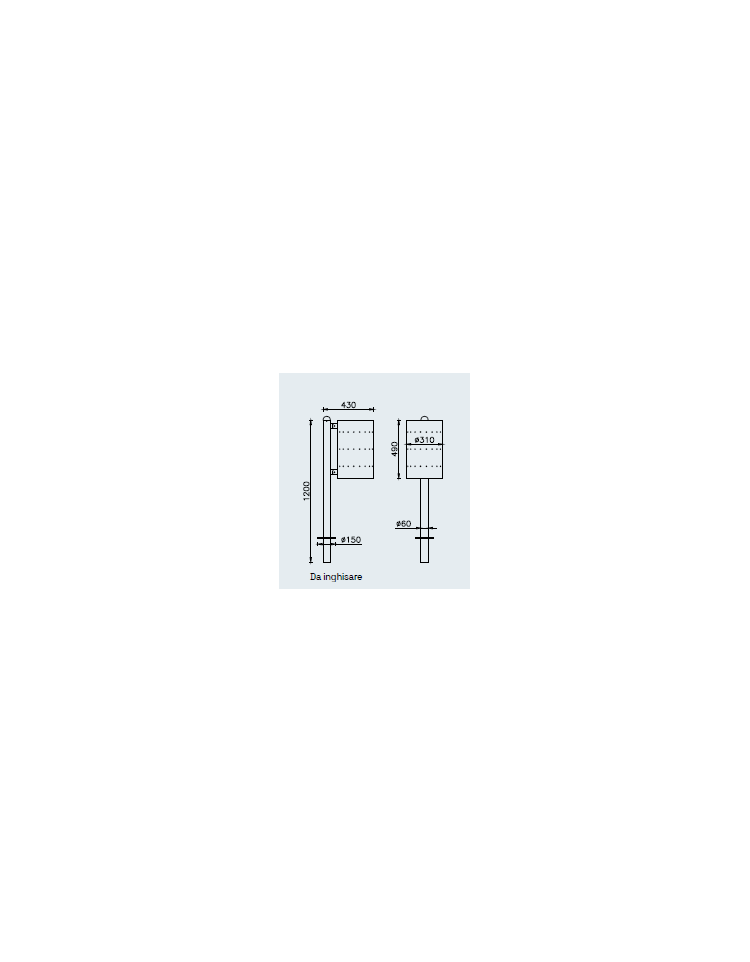 Cestino costituito da un contenitore a forma cilindrica ottenuto dalla punzonatura e successiva calandratura a freddo della lamiera. La parte superiore viene bordata verso l’interno mentre la parte inferiore viene chiusa con un fondello opportunamente forato per l’eventuale scolo di acqua meteorica o di periodica pulizia. Il contenitore viene fissato alla colonnina di sostegno in tubolare di acciaio da inghisare, chiusa superiormente da una calotta semisferica in lamiera ricavata da tornitura di lastra piana, mente la parte inferiore è dotata di flangia per il fissaggio al suolo. Tutte le parti metalliche sono zincate e verniciate a polveri poliestere termoindurenti disponibili in diverse colorazioni RAL.