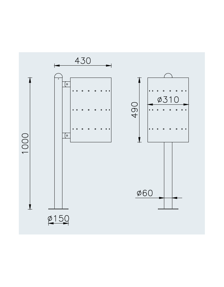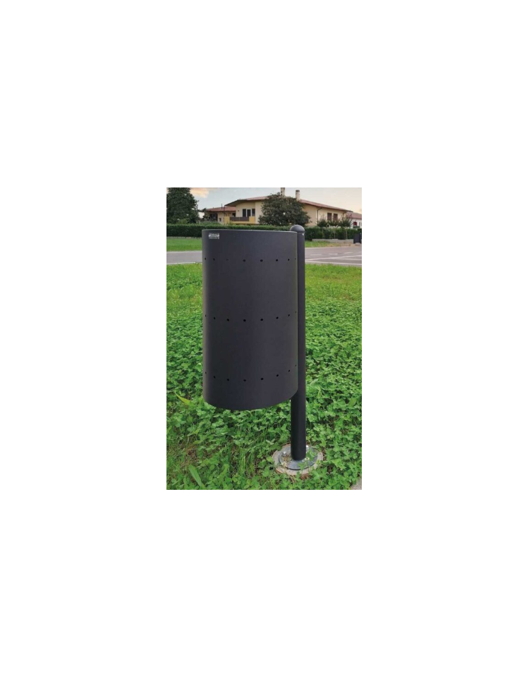 Cestino costituito da un contenitore a forma cilindrica ottenuto dalla punzonatura e successiva calandratura a freddo della lamiera. La parte superiore viene bordata verso l’interno mentre la parte inferiore viene chiusa con un fondello opportunamente forato per l’eventuale scolo di acqua meteorica o di periodica pulizia. Il contenitore viene fissato alla colonnina di sostegno in tubolare di acciaio, chiusa superiormente da una calotta semisferica in lamiera ricavata da tornitura di lastra piana, mente la parte inferiore è dotata di flangia per il fissaggio al suolo. Tutte le parti metalliche sono zincate e verniciate a polveri poliestere termoindurenti disponibili in diverse colorazioni RAL.