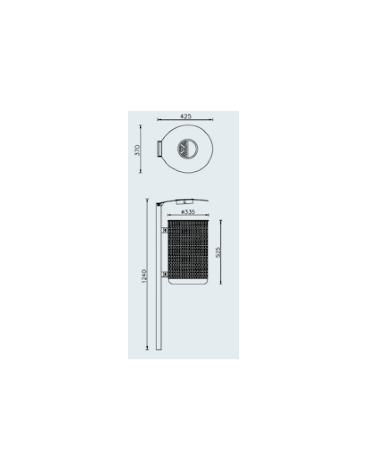 La parte superiore viene bordata con un anello elettrosaldato ottenuto da tornitura in lastra, mentre la parte inferiore viene chiusa con un fondello bombato e forato al centro per facilitare lo scolo di acqua meteorica o di periodica pulizia. Viene fornito completo di anello reggisacco in acciaio. Il contenitore è fissato tramite viti a un sostegno in tubolare di acciaio 120×40 fornito di piastra base 150×150 per il fissaggio al suolo o senza piastra per l’annegamento del palo stesso. All’estremità superiore del tubolare è fissato un coperchio in lamiera spessore 4 mm, ribaltabile per facilitare la rimozione del sacco dei rifiuti, completo di posacenere estraibile Ø150 con rete spegnisigarette. E’ disponibile anche nella versione a muro. Tutte le parti metalliche sono zincate e verniciate a polveri poliestere termoindurenti. La viteria è in acciaio inox.