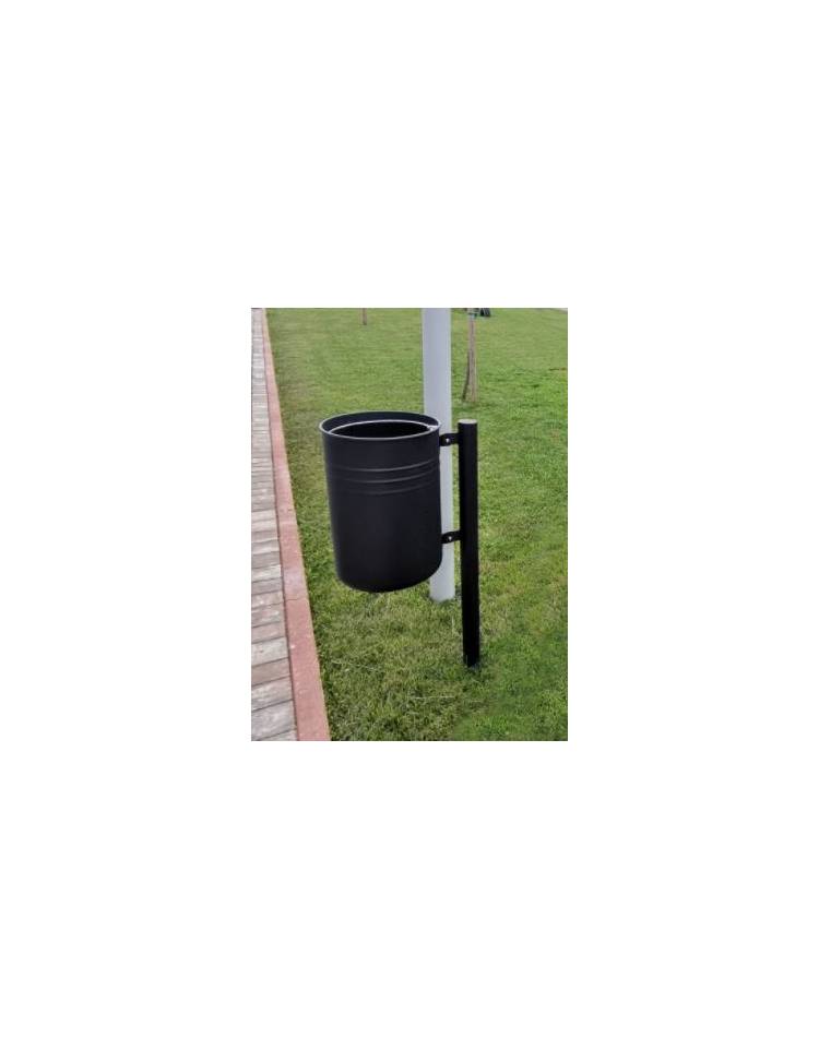 Contenitore a forma cilindrica con nervature, ottenuto dalla calandratura a freddo di lamiera, chiuso tramite elettrosaldatura. La parte superiore viene bordata con un anello elettrosaldato ottenuto da tornitura in lastra, mentre la parte inferiore viene chiusa con un fondello opportunamente forato per l’eventuale scolo di acqua meteorica o di periodica pulizia. Viene fornito completo di reggisacco in acciaio incernierato sul bordo interno superiore dei contenitori e libero di ruotare per facilitare l’inserimento del sacchetto. Il contenitore è sostenuto da un tubolare in acciaio chiuso nella parte superiore con un tappo nero in PVC. Tutte le parti metalliche sono zincate e verniciate a polveri poliestere termoindurenti nelle diverse colorazioni RAL. La viteria è in acciaio inox.