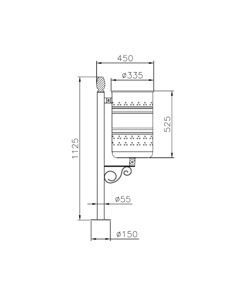 Cestino a forma cilindrica con nervature e forature estetiche, ottenuto dalla calandratura a freddo di lamiera, chiuso tramite elettrosaldatura. La parte superiore viene bordata con un anello elettrosaldato ottenuto da tornitura in lastra, mentre la parte inferiore viene chiusa con un fondello opportunamente forato per l’eventuale scolo di acqua meteorica o di periodica pulizia. Il cestino è dotato di un supporto in tubo d’acciaio, nella estremità superiore porta un elemento a forma di pigna in fusione di ottone brunito mente la parte inferiore è dotato di flangia per il fissaggio al suolo. Tutte le parti sono zincate e verniciate a polveri poliestere termoindurenti disponibili in diverse colorazioni RAL. Particolarmente adatto ai centri storici o borghi medioevali.