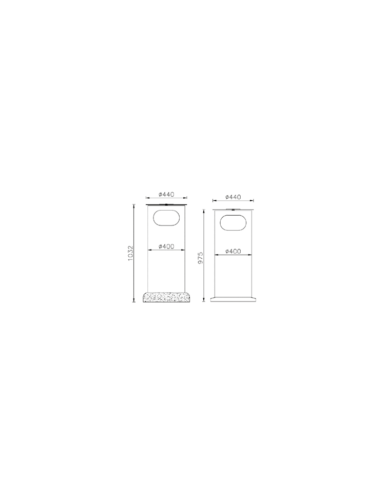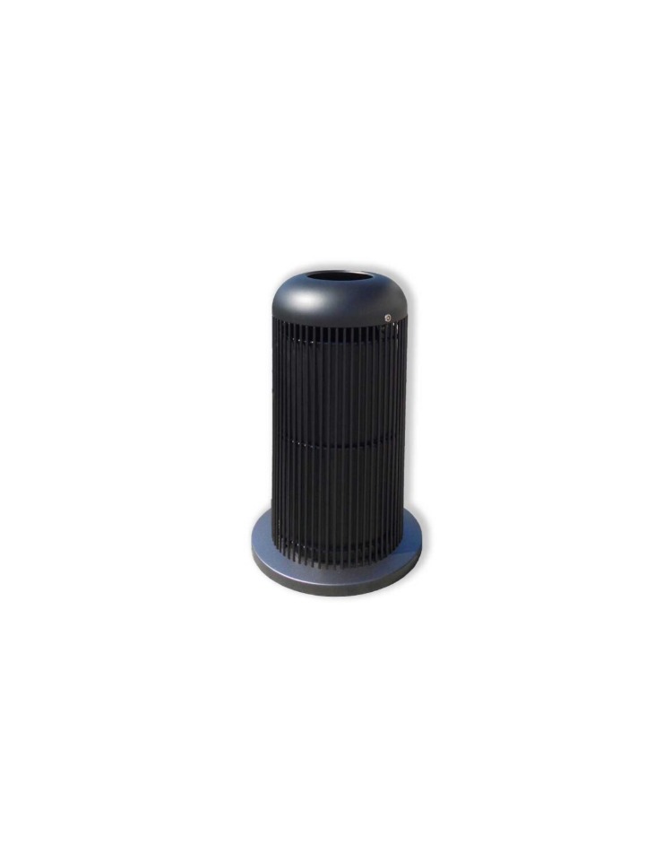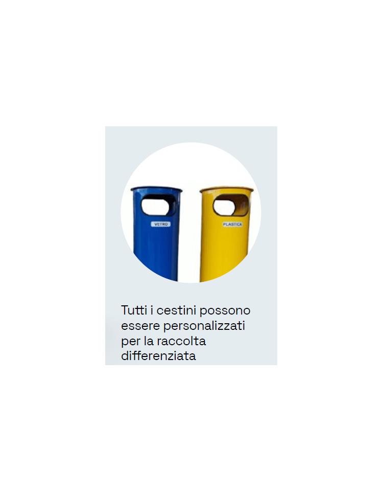 Cestino di forma cilindrica costituito interamente in lamiera, con anello di irrigidimento superiore ed inferiore in piatto di acciaio calandrato che garantisce stabilità e robustezza. L’introduzione dei rifiuti avviene attraverso i due fori laterali ricavati nel corpo cilindrico. Il coperchio superiore apribile è forato al centro per l’introduzione del posacenere estraibile ed è fissato al corpo cilindrico tramite cerniera e serratura di bloccaggio con chiave universale. Il cestino è fornito di contenitore interno. La base di appoggio del cestino è in ferro. Tutte le parti metalliche sono zincate e verniciate a polveri poliestere termoindurenti. La viteria è in acciaio inox.