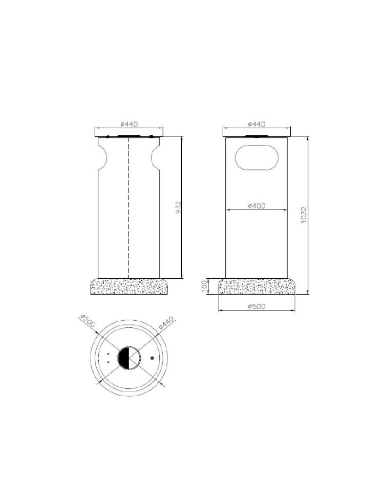Cestino di forma cilindrica costituito interamente in lamiera, con anello di irrigidimento superiore ed inferiore in piatto di acciaio calandrato che garantisce stabilità e robustezza. L’introduzione dei rifiuti avviene attraverso i due fori laterali ricavati nel corpo cilindrico. Il coperchio superiore apribile è forato al centro per l’introduzione del posacenere estraibile ed è fissato al corpo cilindrico tramite cerniera e serratura di bloccaggio con chiave universale. Il cestino è fornito di contenitore interno. La base di appoggio del cestino è in conglomerato di calcestruzzo di forma cilindrica. Tutte le parti metalliche sono zincate e verniciate a polveri poliestere termoindurenti. La viteria è in acciaio inox.