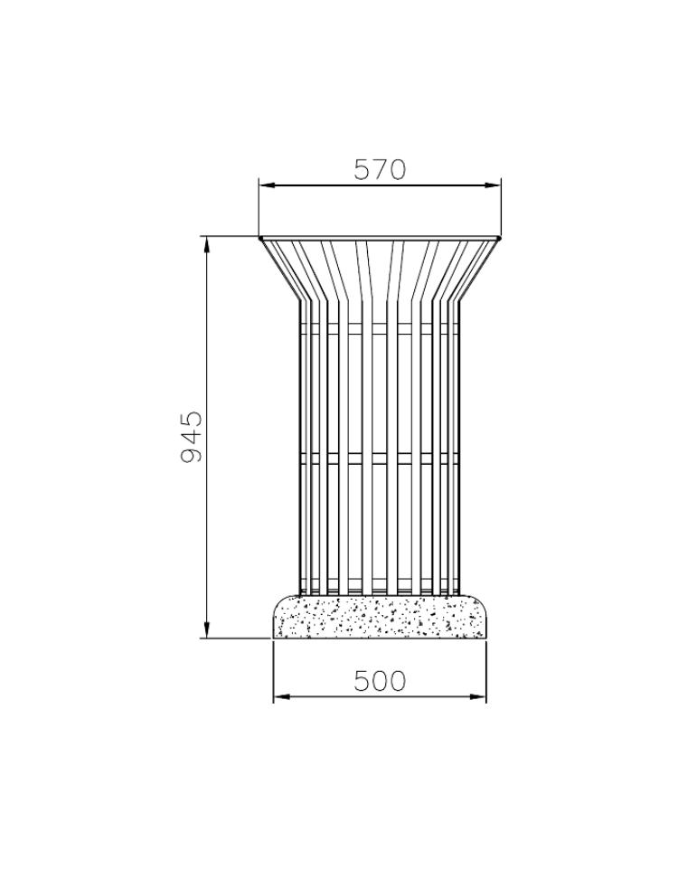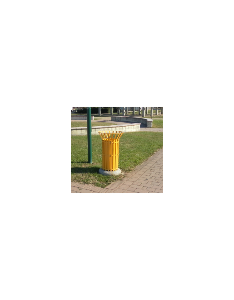 Cestino costituito da 20 raggi in piatto di acciaio opportunamente piegati e uniti con saldatura a tre anelli in piatto di acciaio nella parte inferiore e ad un anello in tondino di acciaio sulla parte superiore. La base è in conglomerato di calcestruzzo (composto da cemento e inerte di fiume lavato). Il cestino è fornito con contenitore interno a forma cilindrica ottenuto dalla calandratura a freddo di lamiera, chiuso tramite elettrosaldatura. La parte superiore viene bordata con un anello elettrosaldato ottenuto da tornitura in lastra, mentre la parte inferiore viene chiusa con un fondello opportunamente forato per l’eventuale scolo di acqua meteorica o di periodica pulizia. Tutte le parti metalliche sono zincate a caldo e verniciate a polveri poliestere termoindurente. La viteria è in acciaio inox.