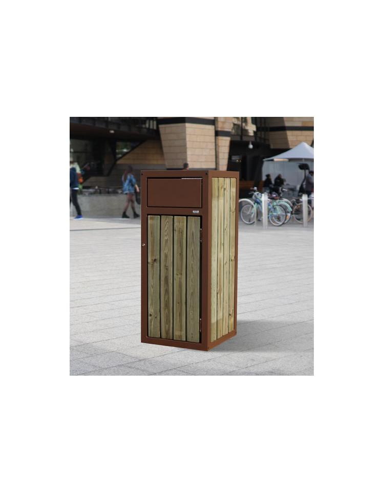 Cestino di forma quadra costituito da un telaio in tubo quadro rivestito da doghe in legno di pregio. La parte superiore è dotata di due aperture per l’introduzione dei rifiuti le quali sono chiuse con due ante apribili in lamiera. L’apertura del cestino avviene tramite la porta frontale dotata di serratura con chiave universale. Il cestino è dotato di contenitore interno in lamiera zincata. La base di appoggio del cestino è provvista di fori per il fissaggio al suolo tramite tasselli ad espansione. Tutte le parti metalliche sono zincate e verniciate a polveri poliestere termoindurenti disponibili in diverse colorazioni RAL.