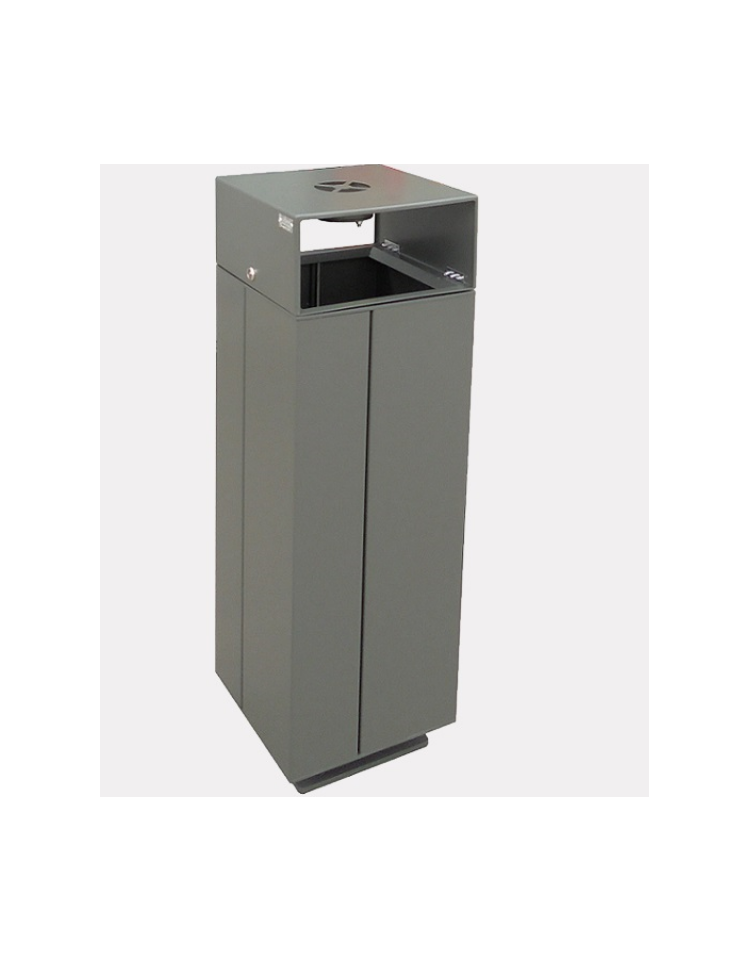 Cestino di forma quadra costituito interamente in lamiera zincata opportunamente piegata e saldata. Il coperchio superiore apribile è forato lateralmente per l’introduzione dei rifiuti ed è completo di posacenere fisso con fondo apribile. Il coperchio è fissato al fusto da 2 cerniere e una serratura con chiave universale. Il cestino è provvisto di contenitore interno in lamiera zincata e di piastra base per il tassellamento a terra. Tutte le parti metalliche sono zincate e verniciate a polveri poliestere termoindurenti. Tutta la viteria è in acciaio inox.