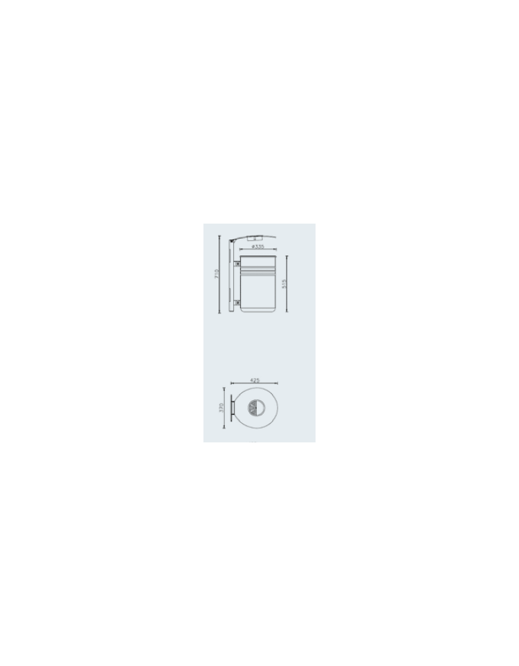 La parte superiore viene bordata con un anello elettrosaldato ottenuto da tornitura in lastra, mentre la parte inferiore viene chiusa con un fondello bombato e forato al centro per facilitare lo scolo di acqua meteorica o di periodica pulizia. Viene fornito completo di anello reggisacco in acciaio. Il contenitore è fissato tramite viti a un sostegno in tubolare di acciaio 120×40 fornito di piastra base 150×150 per il fissaggio al muro. All’estremità superiore del tubolare è fissato un coperchio in lamiera spessore 4 mm, ribaltabile per facilitare la rimozione del sacco dei rifiuti, completo di posacenere estraibile Ø150 con rete spegnisigarette. Tutte le parti metalliche sono zincate e verniciate a polveri poliestere termoindurenti. La viteria è in acciaio inox.