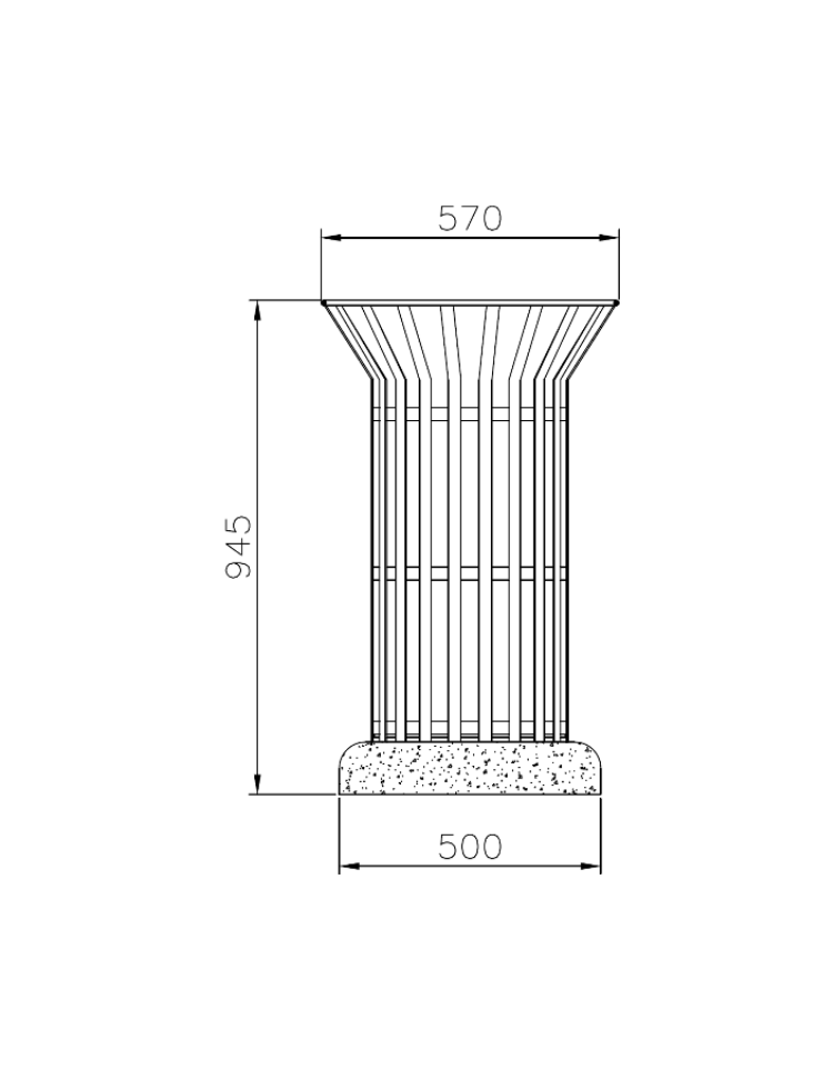 Cestino costituito da 20 raggi in piatto di acciaio 25x4 mm opportunamente piegati e uniti con saldatura a tre anelli in piatto di acciaio 25x4 mm nella parte inferiore e ad un anello in tondino di acciaio diametro 10 mm sulla parte superiore. La base è in conglomerato di calcestruzzo. Il cestino è fornito di contenitore interno a forma cilindrica Ø355 e H.655mm ottenuto dalla calandratura a freddo di lamiera spessore 10/10, chiuso tramite Elettrosaldatura. La parte superiore viene bordata con un anello elettrosaldato ottenuto da tornitura in lastra, mentre la parte inferiore viene chiusa con un fondello opportunamente forato per l’eventuale scolo di acqua meteorica o di periodica pulizia. Tutte le parti metalliche sono zincate e verniciate a polveri poliestere termoindurente disponibili in diverse colorazioni RAL. La viteria è in acciaio inox. Il cestino può essere fornito anche a mezzaluna per il fissaggio a muro o rivestito con doghe in legno di pino. Molto robusto è adatto a zone di grande frequentazione. Facile da svuotare e pulire.