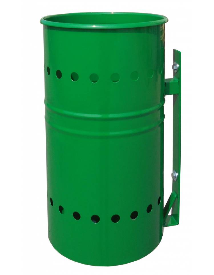 Contenitore a forma cilindrica con nervature, ottenuto dalla calandratura a freddo di lamiera preforata con punzonatrice, chiuso tramite elettrosaldatura. La parte superiore viene bordata con un anello elettrosaldato ottenuto da tornitura in lastra, mentre la parte inferiore viene chiusa con un fondo ricavato da stampaggio e forato al centro per facilitare lo scolo di acqua meteorica o di periodica pulizia. Viene sostenuto da una staffa di acciaio zincato e verniciato, chiuso nella parte superiore con un tappo nero in PVC. Il contenitore è fissato al tubolare di sostegno attraverso una staffa in acciaio predisposta con un incastro alla base del contenitore e un fissaggio con vite nella parte superiore. La staffa è impiegata per il fissaggio a muro tramite tasselli ad espansione. Tutte le parti metalliche sono zincate e verniciate a polveri poliestere termoindurenti. Può essere fornito anche nella finitura zincato a caldo senza verniciatura. La viteria è in acciaio inox.