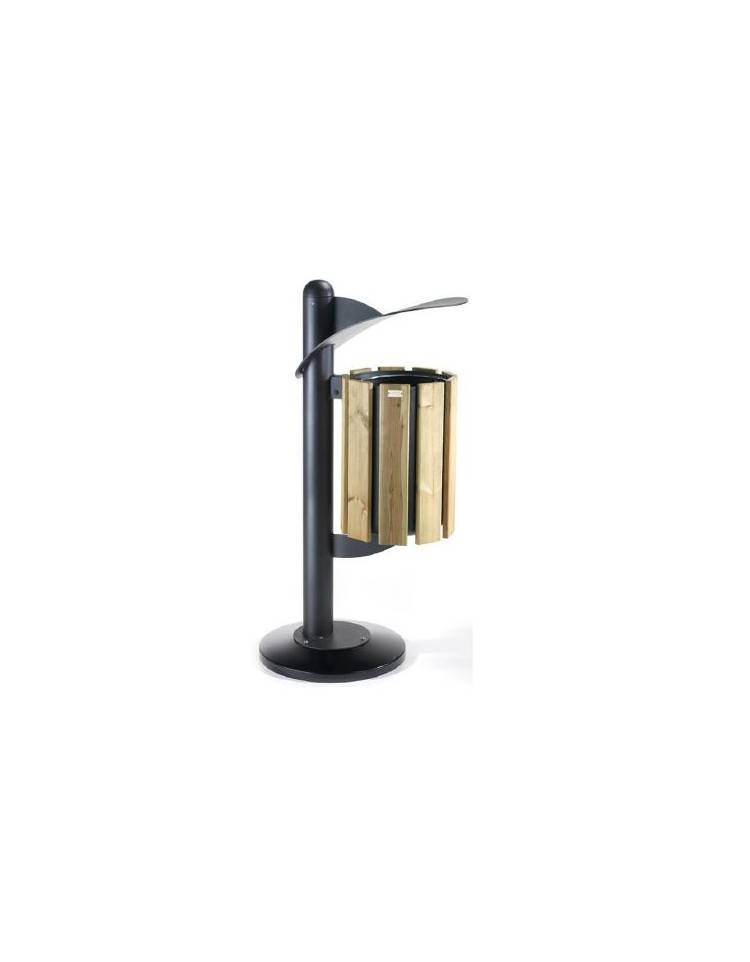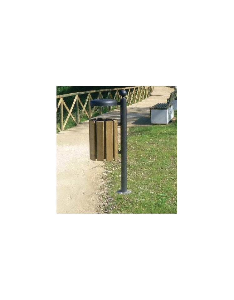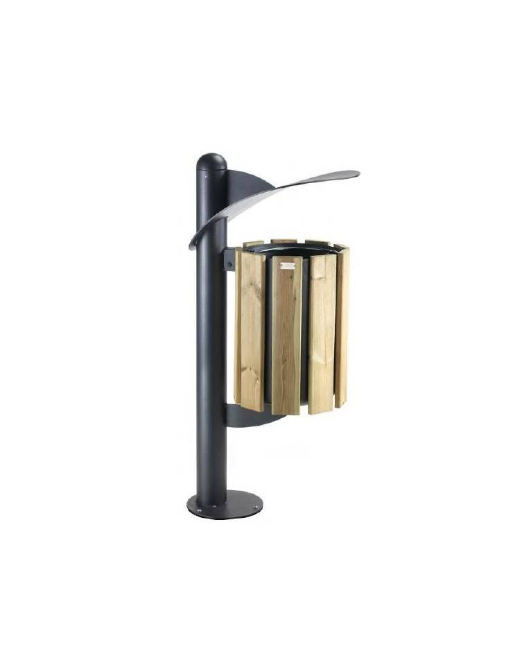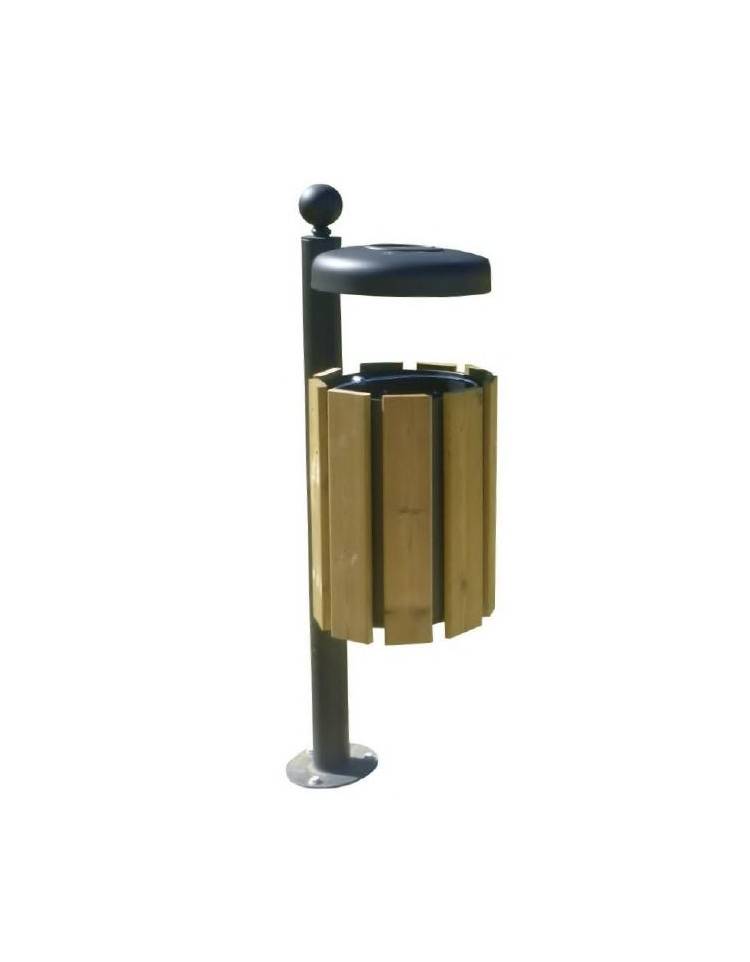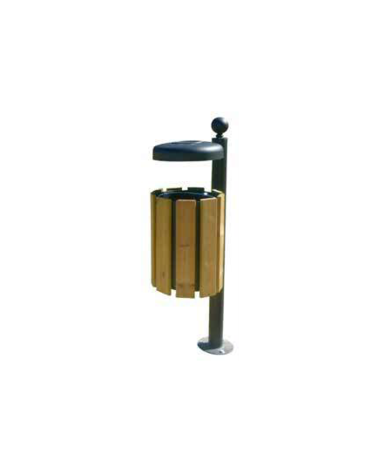 Contenitore a forma cilindrica ottenuto dalla calandratura a freddo di lamiera prezincata spessore 10/10, chiuso tramite elettrosaldatura. La parte superiore viene ribordata verso l’interno mentre la parte inferiore viene chiusa con un fondello bombato e forato al centro per facilitare lo scolo di acqua meteorica o di periodica pulizia. Rivestito di doghe (dim.90x20 L.475) in legno di pino trattato con preservante in autoclave. Viene fornito completo di anello reggi-sacco in acciaio. Il contenitore viene fi ssato alla colonna in tubolare di acciaio Ø102mm mediante due agganci, quello superiore con serratura di tipo universale e quello inferiore con vite e dado. Sbloccando la serratura il contenitore è libero di ruotare per le operazioni di svuotamento e pulitura. La colonna è chiusa superiormente da una calotta semisferica in lamiera ricavata da tornitura di lastra piana, mentre la base è dotata di fl angia Ø240 sp.5 mm predisposta di fori per il fi ssaggio al suolo tramite tasselli ad espansione. Il cestino è fornito di coperchio direttamente saldato alla colonna, costituito da lamiera di acciaio sp.4mm tagliata al laser e adeguatamente bombata. Tutte le parti metalliche sono zincate e verniciate a polveri poliestere termoindurenti secondo le diverse tonalità Ral. Tutta la viteria fornita è in acciaio inox.
