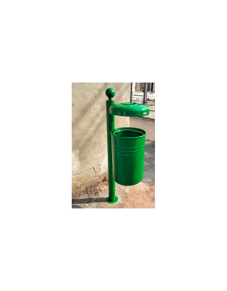 Cestino composto da contenitore a forma cilindrica. La parte superiore viene bordata con un anello elettrosaldato, mentre la parte inferiore viene chiusa con un fondello opportunamente forato per l’eventuale scolo di acqua meteorica o di periodica pulizia. Viene fornito completo di reggisacco in acciaio. Il contenitore viene fissato alla colonna di sostegno in tubolare di acciaio, chiusa superiormente come ornamento da una sfera in acciaio. È dotato di coperchio fissato al palo per riparare da eventi atmosferici, e di posacenere estraibile. Il cestino è zincato e verniciato con polveri poliestere termoindurenti nelle diverse colorazioni. La viteria è in acciaio inox.