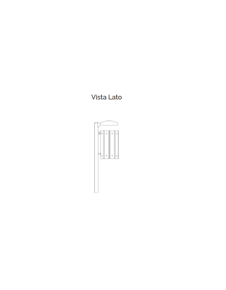 Realizzato con paletto di sostegno in tubo tondo di acciaio Ø 60 mm e altezza cm 120 da interrare. Dotato di tettuccio superiore costituito da disco bombato a lamiera stampata. Il tutto verniciato a forno a 180° C. Cestino di forma cilindrica in lamiera di acciaio rivestito con fasce in pino impregnato in autoclave con sali atossici e verniciato. Sganciamento del cestino con chiave a brugola fornita in dotazione.
