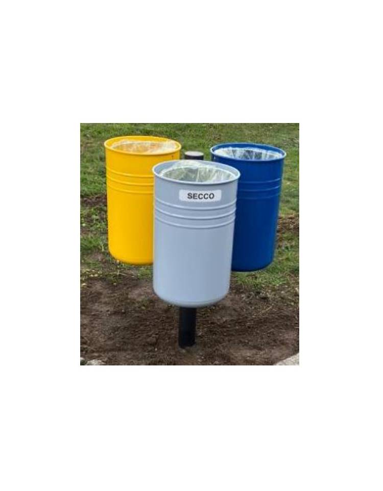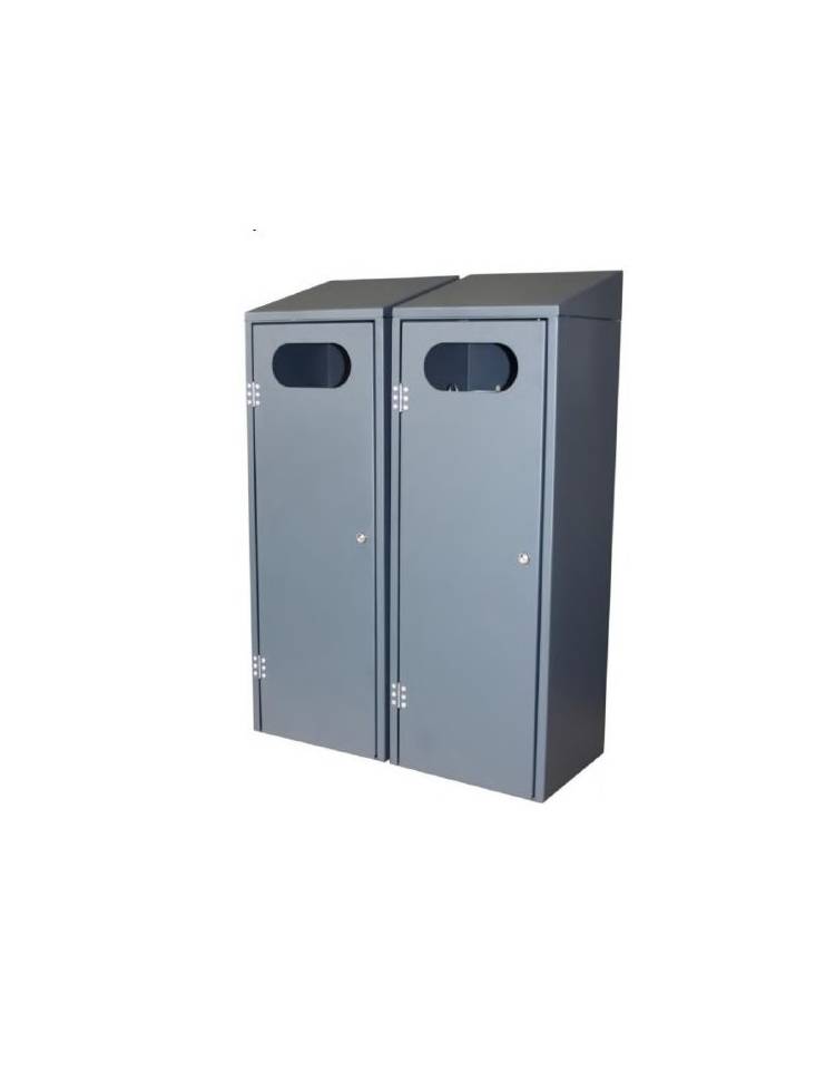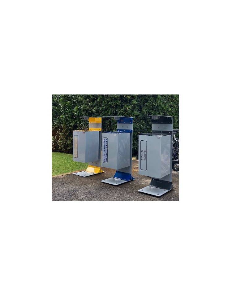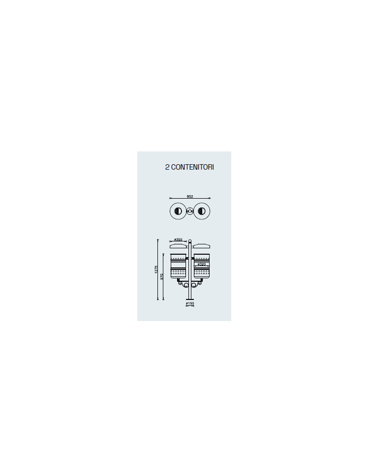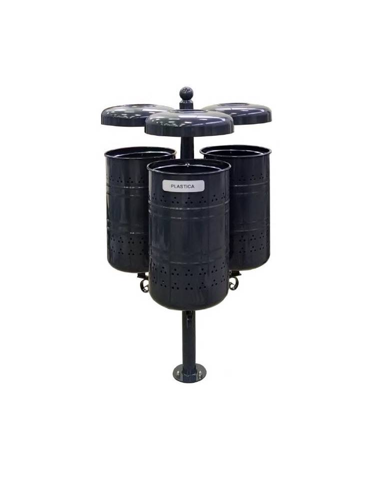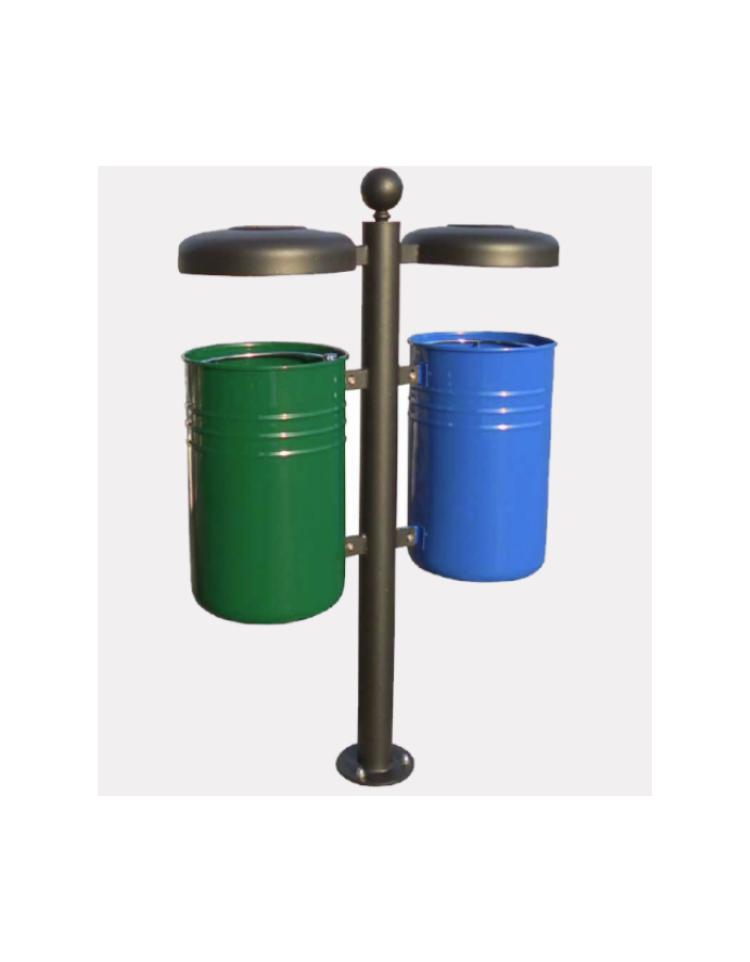 Cestino con 2 contenitori di forma cilindrica con nervature e forature estetiche, ottenuti dalla calandratura a freddo di lamiera prezincata e chiusi tramite elettrosaldatura. La parte superiore è bordata con un anello elettrosaldato ottenuto da tornitura in lastra, mentre la parte inferiore è chiusa con un fondello opportunamente forato per l’eventuale scolo di acqua meteorica o di periodica pulizia. Completi di anello reggisacco. Il palo di sostegno è formato da un tubo tondo, all’estremità superiore come ornamento è saldata una sfera in acciaio forgiato. È fornito da tassellare al pavimento con piastra base. I contenitori sono fissati tramite vite e dado nella parte bassa ad un sostegno ornato con ricciolo e con vite nella parte alta del palo; sbloccando la vite superiore il contenitore è libero di ruotare verso il basso per facilitarne lo svuotamento. È dotato di coperchi fissati sul palo e al cui interno è posizionato un posacenere estraibile. Tutte le parti metalliche sono zincate e verniciate a polveri poliestere termoindurenti secondo le diverse colorazioni RAL. La viteria è in acciaio inox.