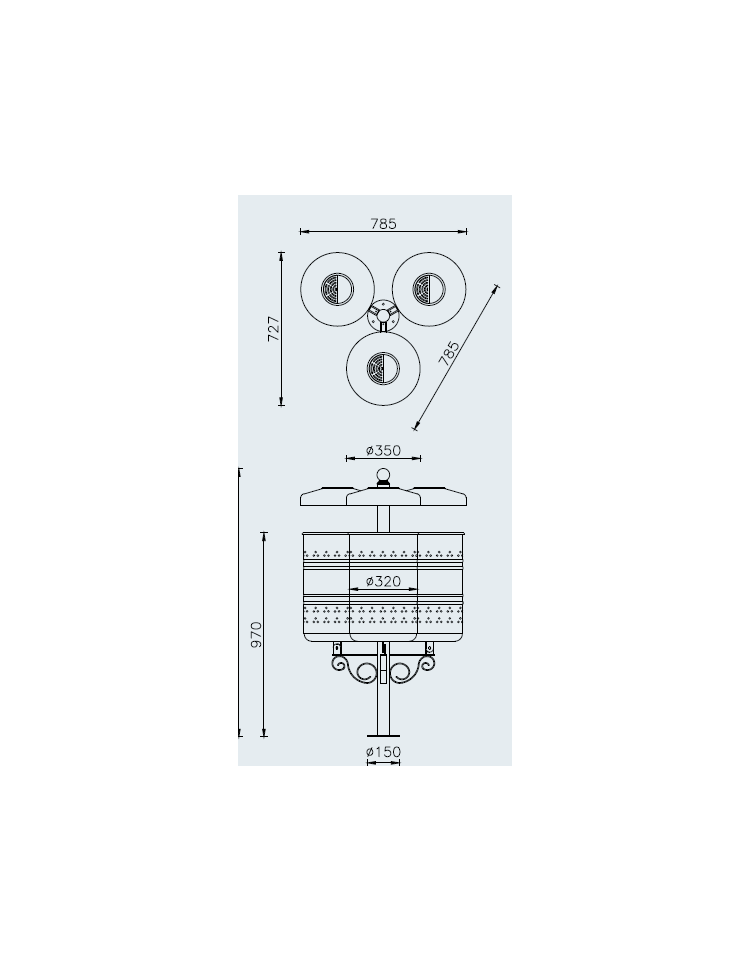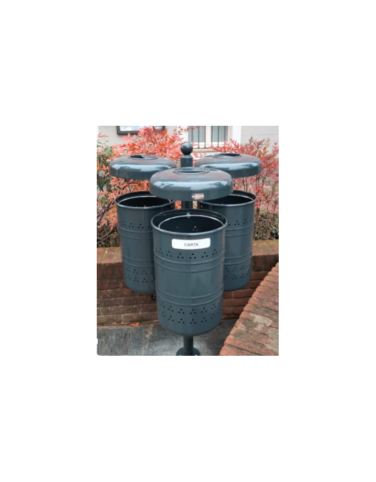 Cestino con 3 contenitori di forma cilindrica con nervature e forature estetiche, ottenuti dalla calandratura a freddo di lamiera prezincata e chiusi tramite elettrosaldatura. La parte superiore è bordata con un anello elettrosaldato ottenuto da tornitura in lastra, mentre la parte inferiore è chiusa con un fondello opportunamente forato per l’eventuale scolo di acqua meteorica o di periodica pulizia. Completi di anello reggisacco. Il palo di sostegno è formato da un tubo tondo, all’estremità superiore come ornamento è saldata una sfera in acciaio forgiato. È fornito da tassellare al pavimento con piastra base. I contenitori sono fissati tramite vite e dado nella parte bassa ad un sostegno ornato con ricciolo e con vite nella parte alta del palo; sbloccando la vite superiore il contenitore è libero di ruotare verso il basso per facilitarne lo svuotamento. È dotato di coperchi fissati sul palo e al cui interno è posizionato un posacenere estraibile. Tutte le parti metalliche sono zincate e verniciate a polveri poliestere termoindurenti secondo le diverse colorazioni RAL. La viteria è in acciaio inox.