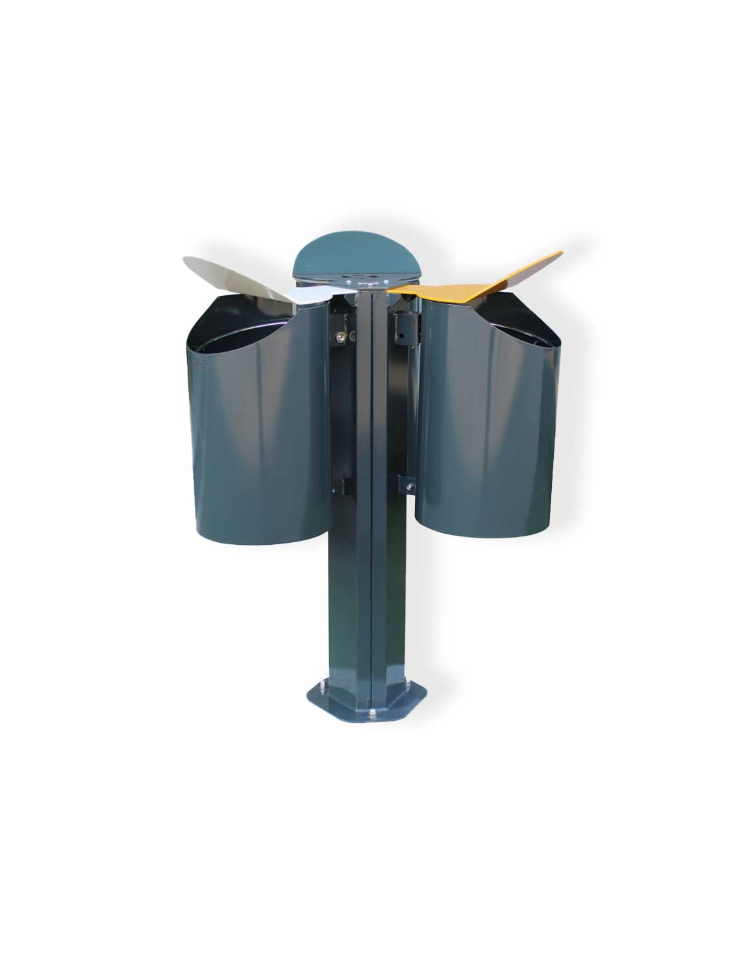 Cestone per raccolta differenziata. Realizzato con struttura portante in tubolare di acciaio. Base predisposta per l'ancoraggio al terreno. Tettuccio in lamiera di acciaio sagomata fissato sulla struttura con 4 bulloni in acciaio inox. Pareti laterali in lamiera di acciaio sagomate e rinforzate con bordature.Pannellature in bilaminato stratificato HPL pantografati.