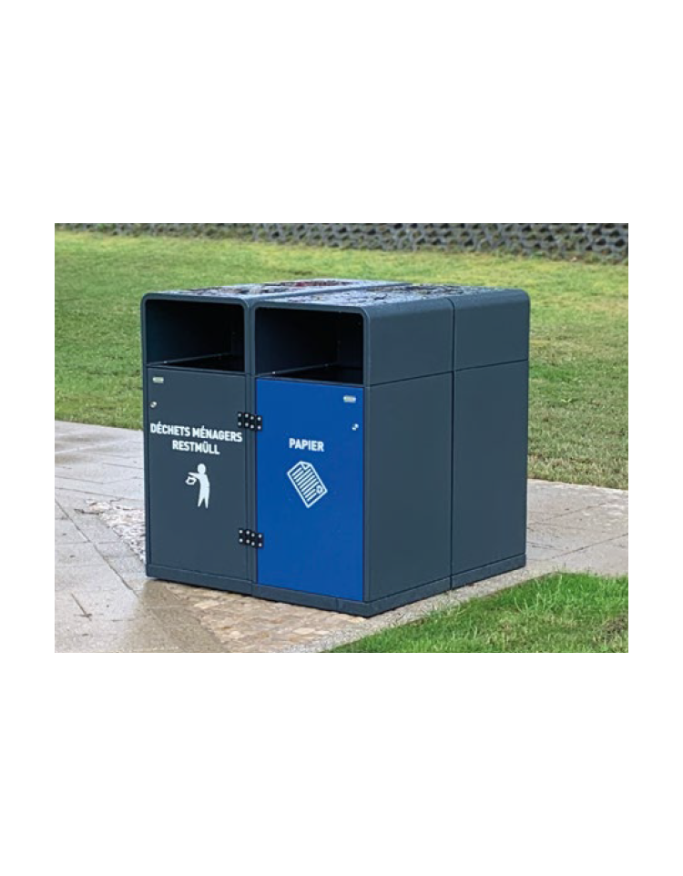 Cestino per la raccolta differenziata angolare .Cestino ricavato interamente in lamiera tagliata al laser e opportunamente sagomata. La forma del cestino, ovvero il suo telaio portante, fa in modo che la sua parte superiore funga da coperchio contro l’acqua piovana ma anche limiti l’introduzione di rifiuti troppo voluminosi. L’anta frontale è dotata di cerniere e serratura con chiave universale. Completo di contenitore interno estraibile in lamiera zincata. Tutte le parti metalliche sono zincate e verniciate a polveri epossidiche in varie colorazioni RAL. Predisposto per il tassellamento al suolo. La viteria è in acciaio inox.