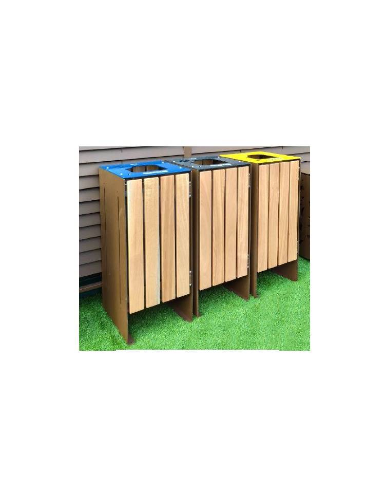 Cestino per la raccolta differenziata a 4 settori – legno di pregio. Cestino di forma quadra costituito da due fianchi in acciaio collegati tra loro dal fondo e dalla piastra superiore sempre in acciaio, il tutto tagliato con tecnologia laser, piegato e saldato assieme. Il fronte ed il retro del cestino invece sono rivestiti di doghe in legno di pregio; il rivestimento frontale però è dotato di cerniere e serratura con chiave universale per abilitare lo svuotamento del contenitore interno in lamiera zincata. La parte superiore del cestino è dotata di un’apertura per l’introduzione dei rifiuti. La base di appoggio del cestino è provvista di fori per il fissaggio al suolo tramite tasselli ad espansione. Tutte le parti metalliche sono zincate e verniciate a polveri poliestere termoindurenti.