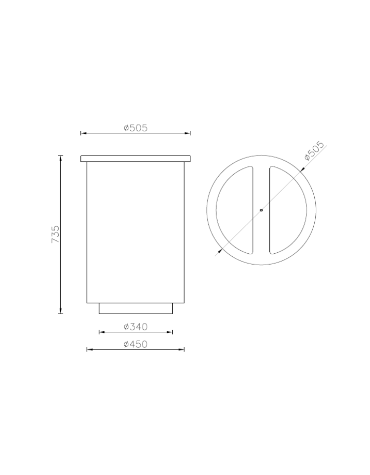 Struttura cilindrica esterna composta in lamiera d’acciaio forata calandrata con fondo in lamiera d’acciaio che poggia su una base circolare.