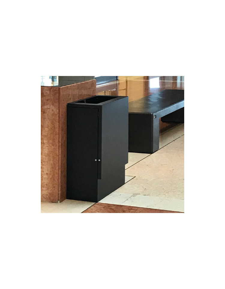 Cestino di forma rettangolare costituito interamente in lamiera zincata opportunamente piegata e saldata. L’apertura del cestino avviene tramite un porta dotata di serratura con chiave universale, nella cui parte superiore è situato il foro per l’introduzione dei rifiuti. Il cestino è provvisto di contenitore interno in lamiera zincata. Tutte le parti metalliche sono zincate e verniciate a polveri poliestere termoindurenti. Il contenitore interno può essere diviso per la raccolta differenziata dei rifiuti (2/3 settori). Tutta la viteria è in acciaio inox.