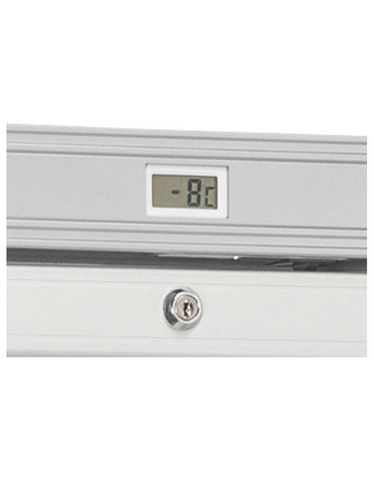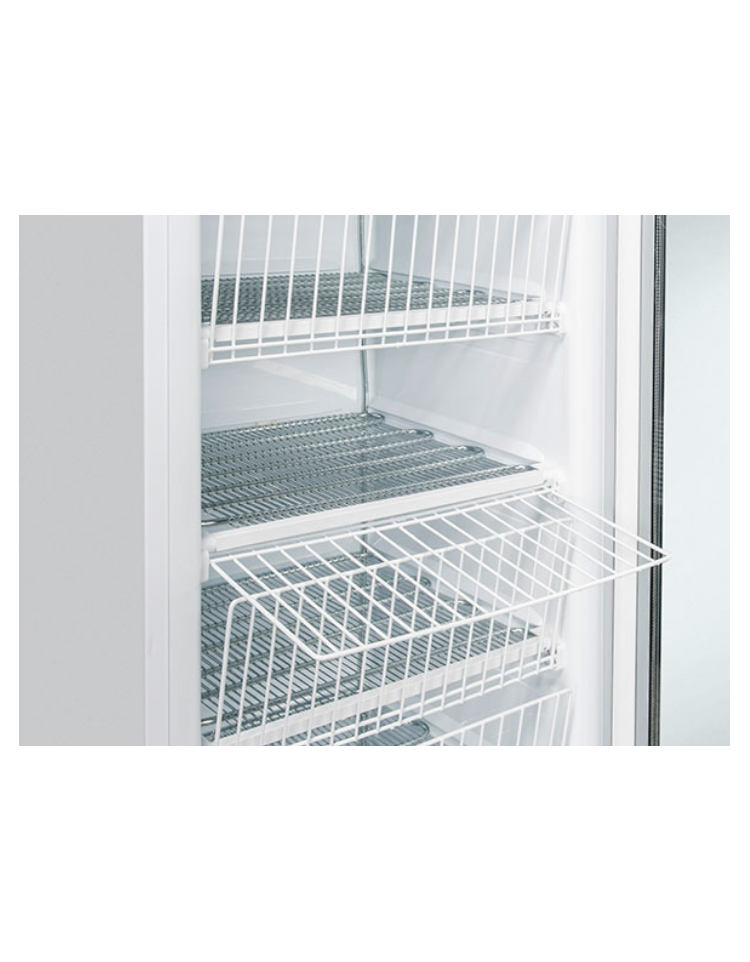 Congelatore verticale da 300L di colore bianco con maniglia esterna rettangolare. Equipaggiato con porta in vetro riscaldata con doppio vetro temperato di sicurezza, sistema di raffreddamento statico con ripiani evaporatori fissi, serratura, porta autochiudente, luce interna orizzontale a LED con interruttore indipendente, termostato meccanico e termometro digitale. Il modello è stato progettato per essere utilizzato in molteplici modi, garantendo sempre una corretta conservazione degli alimenti per una corretta esposizione e apprezzamento dei prodotti all’interno.