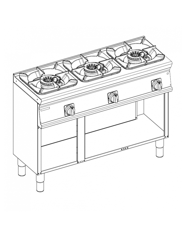 Cucina a gas 3 fuochi in acciaio Inox su vano aperto, con piano ermetico - potenza fuochi 3x11kw - cm 120x45x90h