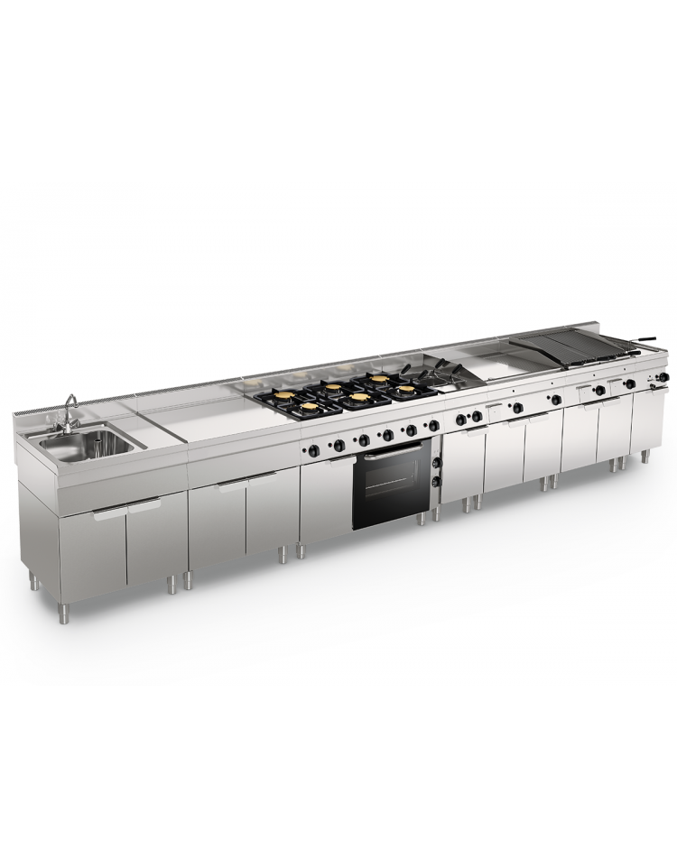 Piano di lavoro stampato con angoli arrotondati per evitare traboccamenti e per la massima igiene e facilità di pulizia realizzato in acciaio inox AISI 304 con finitura Scotch Brite.