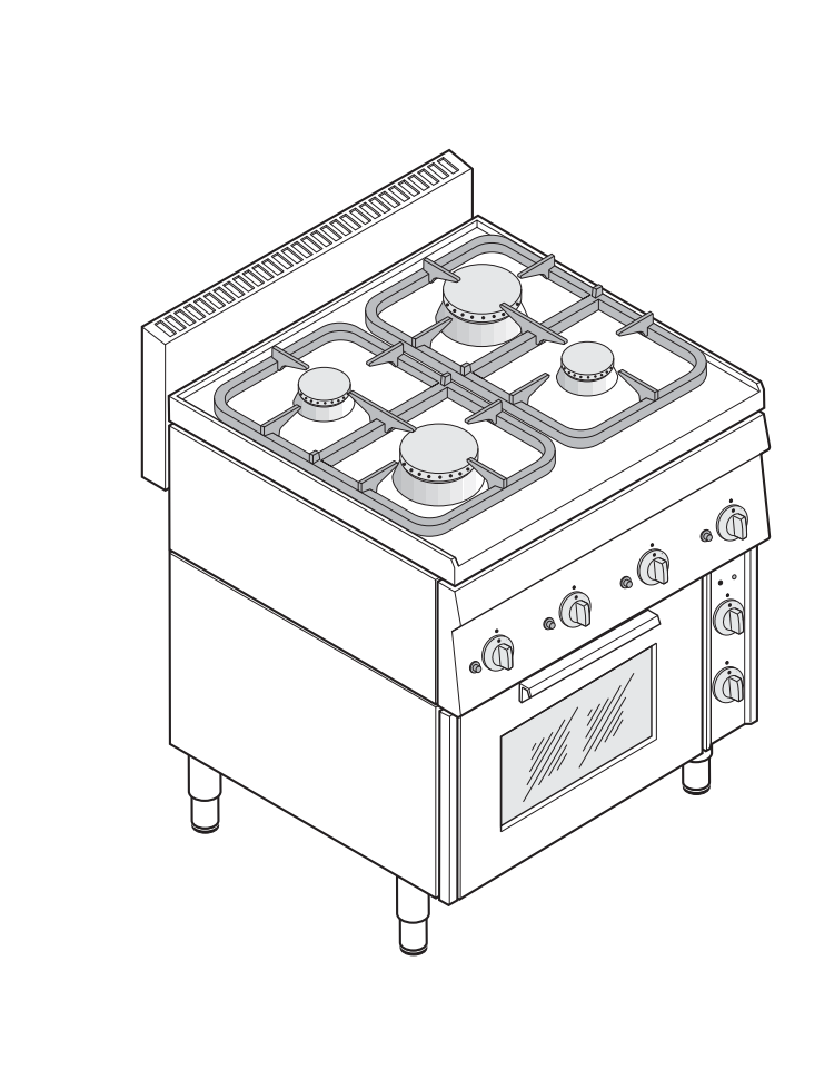 Cucina a gas 4 fuochi, 2x3,3Kw + 2x5,2Kw - su forno elettrico ventilato, camera cm 46x41,5x32h - cm 70x65x85h