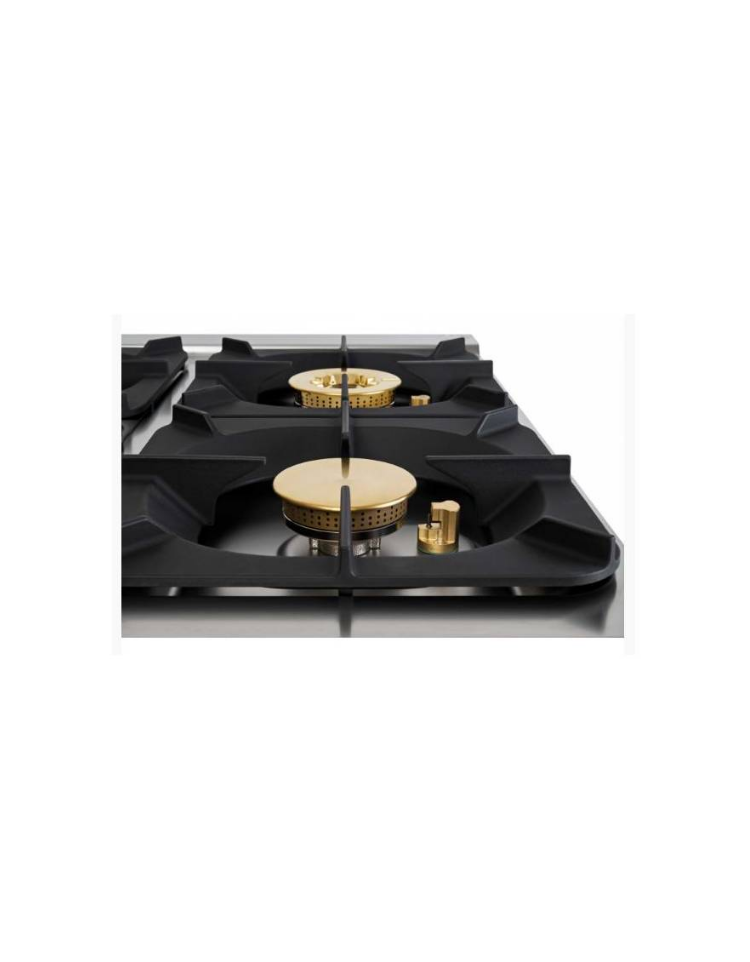 Bruciatori in ghisa ad elevata efficienza fissati ermeticamente al piano e spartifiamma in ottone ad alta durabilità monocorona da 10kW e doppia corona da 11kW.