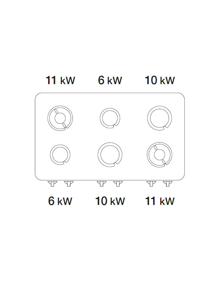 Bruciatori in ghisa ad elevata efficienza fissati ermeticamente al piano e spartifiamma in ottone ad alta durabilità monocorona da 6kW e 10kW e doppia corona da 11kW.