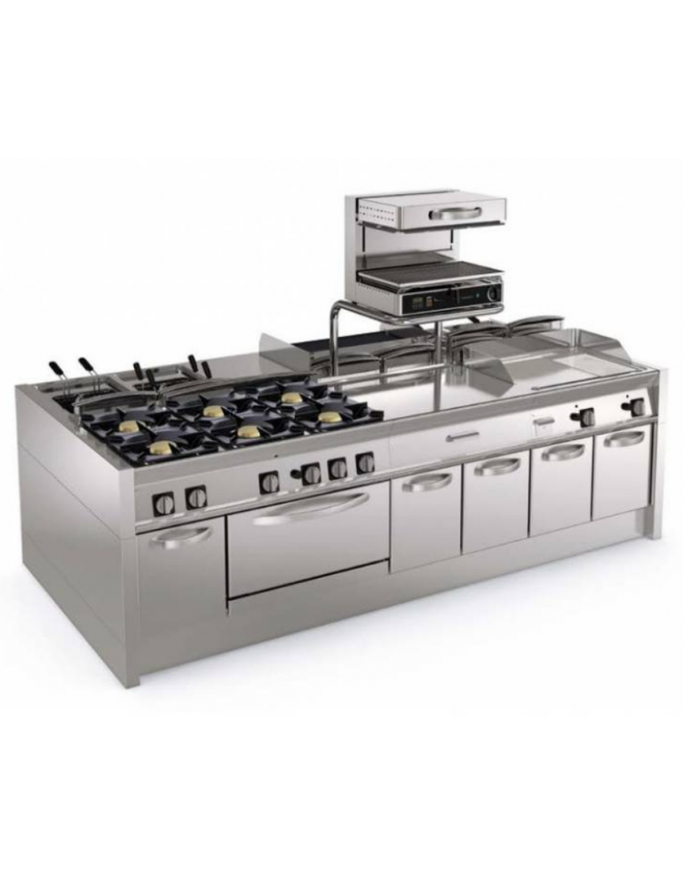 Cucina a gas 6 fuochi in acciaio Inox su vano aperto, con piano ermetico - potenza fuochi 6x7,5kw - cm 120x70x90h