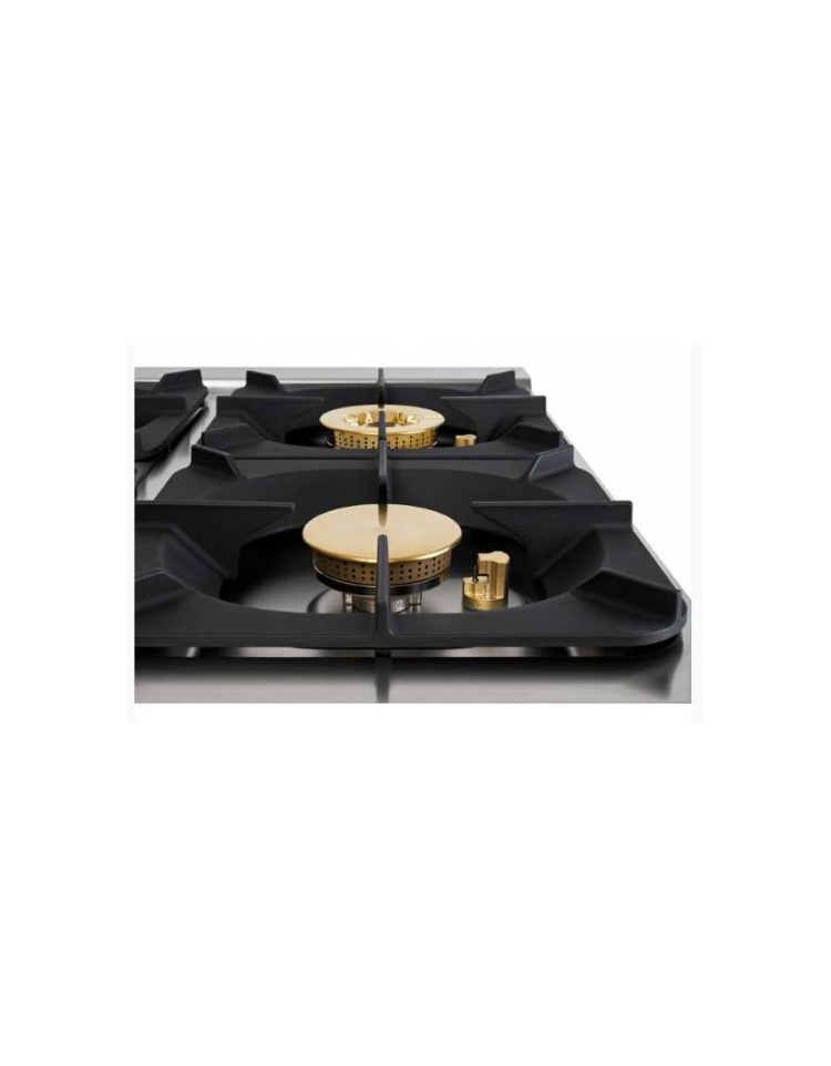 Bruciatori in ghisa ad elevata efficienza fissati ermeticamente al piano e spartifiamma in ottone ad alta durabilità monocorona da 6kW e 10kW e doppia corona da 11kW.