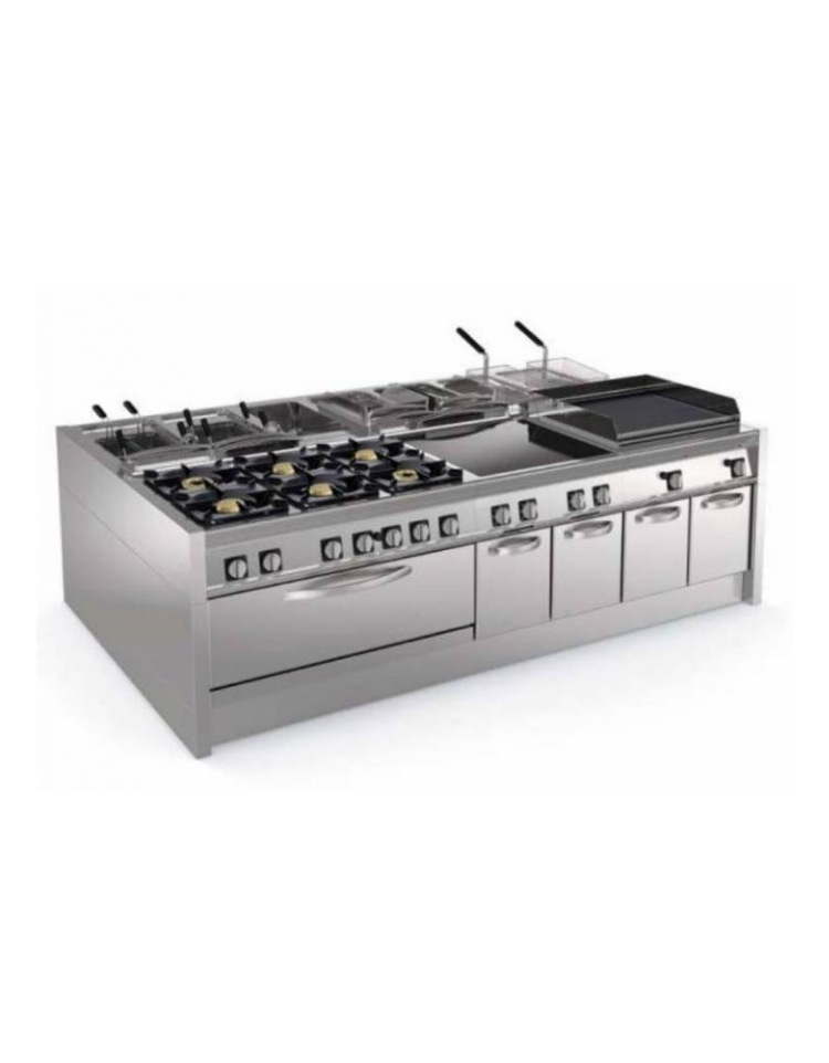 Cucina a gas ermetica 4 fuochi, 1x6kw+2x10kw+1x11kw - su forno elettrico statico GN 2/1, camera cm 57,5x65x30h - cm 80x90x90h