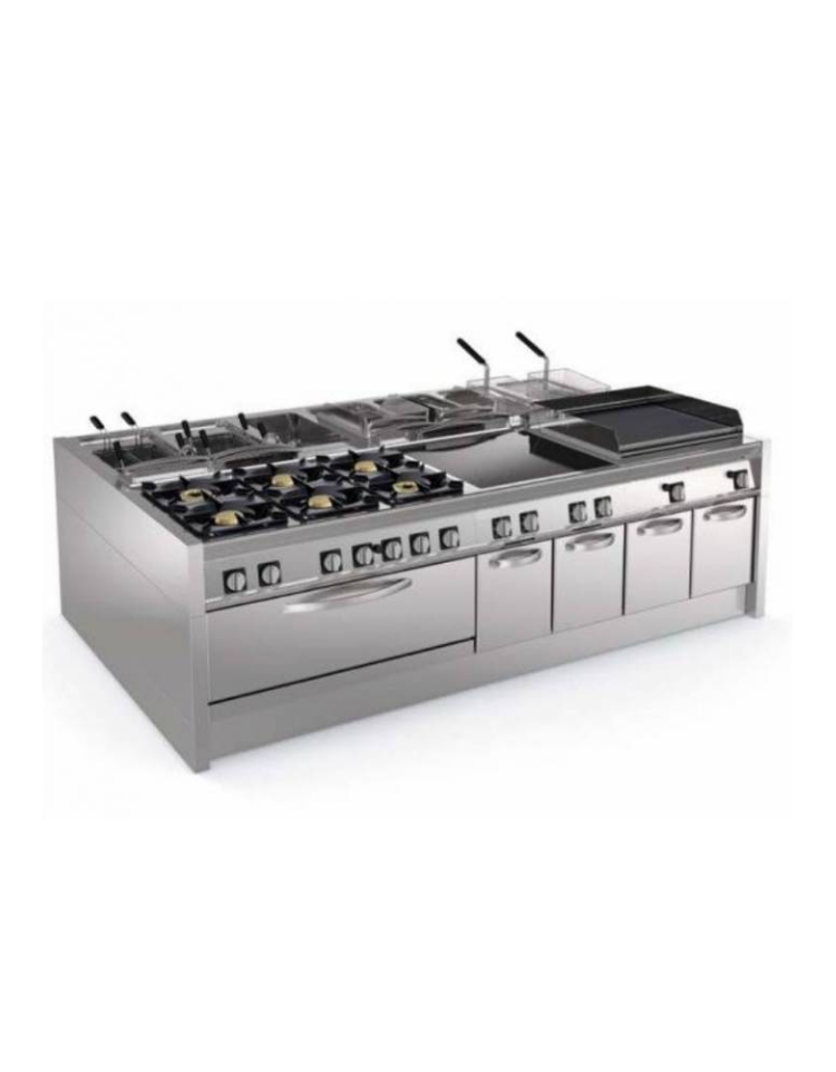 Cucina a gas ermetica 4 fuochi, potenza 1x6kw + 2x10kw + 1X11kw - su forno elettrico ventilato GN 1/1 - cm 80x90x90h