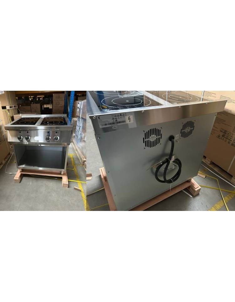 Realizzato in resistente acciaio inossidabile, rinforzato con telaio. 3 piani cottura a induzione separati, 320x560 mm ciascuno, realizzati in vetro temperato spesso 5 mm. Dotato di 3 bruciatori a induzione da 5000 W e 3 da 3500 W. Risparmio energetico fino al 60% rispetto alle cucine elettriche standard.
