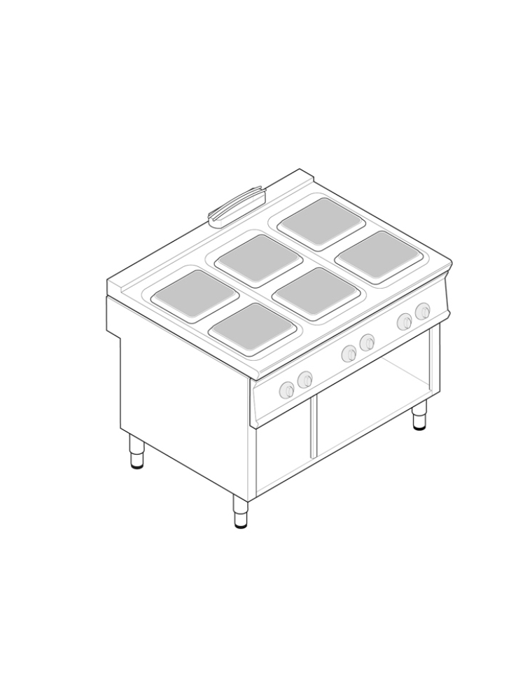 Piano di cottura elettrico freestanding con 6 piastre quadrate su vano aperto da 120 cm.