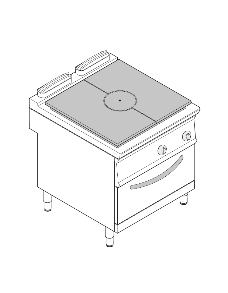 Cucina tuttapiastra a gas su forno a gas statico GN 2/1 da 80 cm.