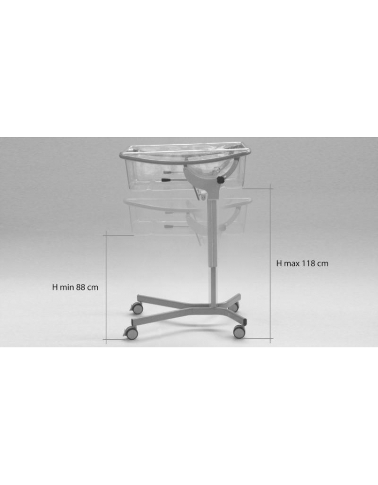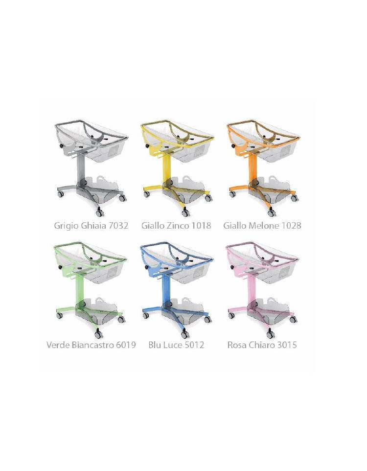 Culla per neonati ad altezza variabile realizzata in profili di acciaio verniciato a polveri epossidiche, basamento a "C" con forma tale da permettere di avvicinare la culla al letto, completo di 4 ruote gemellate piroettanti, Ø 75 mm, in poliammide e battistrada in gomma anti traccia, 2 con freno indipendente.