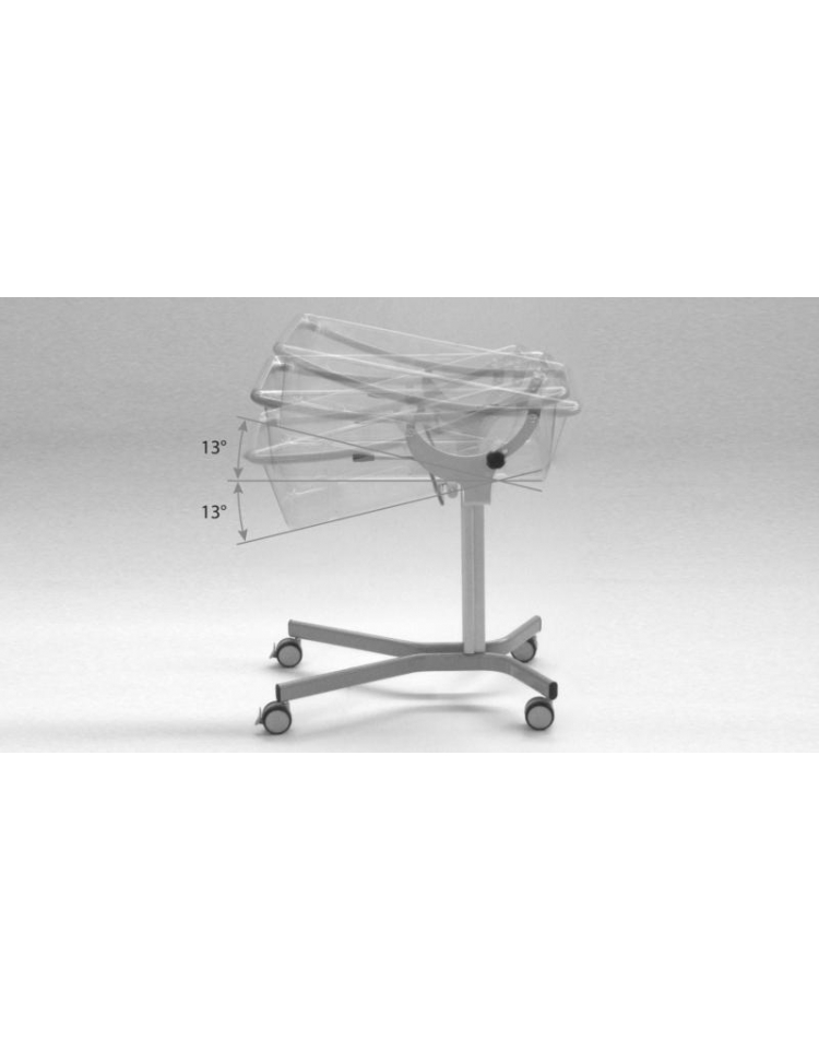 Supporto vasca basculante con fermi di sicurezza e indicatore di orizzontalità, regolabile e bloccabile attraverso volantini posizionati su entrambi i lati, possibilità di posizionamento della culla in orizzontale, in trendelenburg (max -13°) e in controtrendelenburg (max 13°).